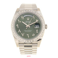 Silver-tone platinum case with a silver-tone platinum president bracelet. Fixed silver-tone bezel with diamond set platinum. Green dial with silver-tone hands and Arabic numeral hour markers. Dial Type: Analog. Date display at the 3 o'clock position. Rolex Calibre 3255 Automatic movement, based upon Rolex 3035, containing 31 Jewels, bitting at 28800 vph, and has a power reserve of approximately 70 hours. Scratch resistant sapphire crystal. Screw down crown. Solid case back. Round case shape, case size: 40 mm. Crown clasp. Water resistant at 100 meters / 330 feet. Functions: date, day, hour, minute, second, chronometer, shock resistant, magnetic resistant. Additional Info: original box, international warranty card, manual (complete accessories). Day-date Series. Luxury watch style. Watch label: Swiss Made. Rolex Day-Date Automatic Chronometer Diamond Green Dial Men's Watch 228396TBR-0032. CASE Case Size: 40 Case Material: Platinum Case Shape: Round Case Back: Solid BAND Band Material: Platinum President Band Type: Bracelet Band Color: Silver-tone Clasp: Crownclasp DIAL Dial Color: Green Type: Analog Crystal: Scratch Resistant Sapphire Hands: Silver-tone Dial Markers: Arabic Numeral Bezel: Fixed Bezel Color: Silver-tone Bezel Material: Diamond Set Platinum Crown: Screw Down INFORMATION Brand: Rolex Series: Day-Date Collection Name: Day-Date Gender: Mens Model: 228396TBR-0032 Watch Label: Swiss Made Movement: Automatic Engine: Rolex Calibre 3255 Power Reserve: 70 hours FEATURES Water Resistance: 100 meters / 330 feet Calendar: Date display at the 3 o'clock position Functions: Date, Day, Hour, Minute, Second, Chronometer, Shock Resistant, Magnetic Resistant Watch Features: Diamond, Chronometer, Platinum, Analog ADDITIONAL INFO Watch Style: Luxury Warranty: 2 Year Jomashop Warranty Additional Info: Original Box, Manual (Complete Accessories) Jomashop Sku: RLX228396TBR0032 Department: Watches Category: Watches
