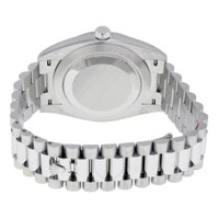 Platinum case with a platinum Rolex president bracelet. Fixed platinum bezel. Ice blue dial with blue hands and alternating index and Roman numeral hour markers. Minute markers around the outer rim. Dial Type: Analog. Date display at the 3 o'clock position. Day of the week display centered on the 12 o'clock position. Rolex calibre 3255 automatic movement with a 70-hour power reserve. Scratch resistant sapphire crystal. Screw down crown. Solid case back. Round case shape. Case size: 40 mm. Concealed crown clasp. Water resistant at 100 meters / 330 feet. Functions: date, day, hour, minute, second, chronometer. Luxury watch style. Watch label: Swiss Made. Rolex Day-Date Automatic Ice Blue Dial Platinum Men's Watch 228206IBLSRP. CASE Case Size: 40 Case Color: Grey Case Material: Platinum Case Shape: Round Case Back: Solid BAND Band Material: Platinum Rolex President Band Type: Bracelet Band Color: Grey Clasp: Concealed Crown DIAL Dial Color: Ice Blue Type: Analog Crystal: Scratch Resistant Sapphire Hands: Blue Dial Markers: Index and Roman Numeral Second Markers: Minute Markers around the outer rim Bezel: Fixed Bezel Color: Grey Bezel Material: Platinum Crown: Screw Down INFORMATION Brand: Rolex Series: Day-Date 40 Collection Name: Day-Date 40 Gender: Mens Model: 228206IBLSRP Watch Label: Swiss Made Movement: Automatic Engine: Rolex Calibre 3255 Power Reserve: 70 hours FEATURES Water Resistance: 100 meters / 330 feet Calendar: Date display at the 3 o'clock position. Day of the Week display centered on the 12 o'clock position Functions: Date, Day, Hour, Minute, Second, Chronometer Watch Features: Chronometer, Platinum, Analog ADDITIONAL INFO Watch Style: Luxury Warranty: 2 Year Jomashop Warranty UPC Code: 842047103647 Jomashop Sku: RLX228206IBLSRP Item Variation: m228206-0001, m228206, 228206-0001, 228206 Department: Watches Category: Watches