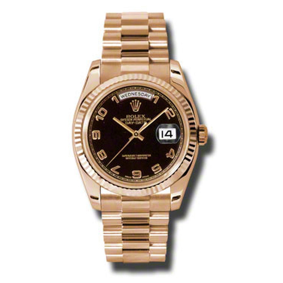 18k everose gold case with a 18k everose gold Rolex President bracelet. Fixed - fluted 18k everose gold bezel. Black dial with rose-gold tone hands and Arabic numeral hour markers. Dial Type: Analog. Date display at 3 o'clock; day display at 12 o'clock.. Automatic movement. Scratch resistant sapphire crystal. Screw down crown. Solid case back. Case diameter: 36 mm. Round case shape. Concealed Crown clasp. Water resistant at 100 meters / 330 feet. Functions: date, day, hour, minute, second. Luxury watch style. Watch label: Swiss Made. Rolex Day-Date Black Dial 18K Everose Gold President Automatic Ladies Watch 118235BKAP. GENERAL Color: Black / Gold / Rose INFORMATION Brand: Rolex Series: Day-Date Collection Name: Day-Date Gender: Womens Model: 118235BKAP Watch Label: Swiss Made Movement: Automatic Engine: Rolex Calibre 3155 Power Reserve: 48 hours CASE Case Size: 36 mm Case Material: 18kt Everose Gold Case Shape: Round Case Back: Solid BAND Band Material: 18kt Everose Gold Rolex President Band Type: Bracelet Band Color: Pink Gold-tone Clasp: Concealed Crown DIAL Dial Color: Black Type: Analog Crystal: Scratch Resistant Sapphire Hands: Rose-Gold Tone Dial Markers: Arabic Numeral Bezel: Fixed Fluted Bezel Material: 18kt Everose Gold Crown: Screw Down FEATURES Water Resistance: 100 meters / 330 feet Calendar: Date display at 3 o'clock; Day Display at 12 o'clock. Functions: Date, Day, Hour, Minute, Second, Chronometer Watch Features: Gold, Chronometer, Analog ADDITIONAL INFO Watch Style: Luxury Warranty: 2 Year Jomashop Warranty UPC Code: 845960076302 Jomashop Sku: RLX118235BKAP Department: Watches Category: Watches
