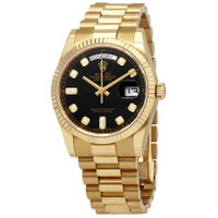 18kt yellow gold case with a 18kt yellow gold rolex president bracelet. Fixed fluted 18kt yellow gold bezel. Black dial with yellow gold-tone hands and diamond hour markers. Minute markers around the outer rim. Dial Type: Analog. Date display at 3 o'clock; day display at 12 o'clock.. Rolex Calibre 3155 automatic movement with a 48-hour power reserve. Scratch resistant sapphire crystal. Screw down crown. Solid case back. Round case shape. Case size: 36 mm. Concealed crown clasp. Water resistant at 100 meters / 330 feet. Functions: date, day, hour, minute, second, chronometer. Luxury watch style. Watch label: Swiss Made. Item Variations: 118238, 118238-BKDP, Rolex-118238, Rolex-118238-BKDP. Rolex Day-Date Black Dial 18K Yellow Gold President Automatic Men's Watch 118238BKDP. GENERAL Color: Black / Gold / Yellow CASE Case Size: 36 Case Material: 18kt Yellow Gold Case Shape: Round Case Back: Solid BAND Band Material: 18kt Yellow Gold Rolex President Band Type: Bracelet Clasp: Concealed Crown DIAL Dial Color: Black Type: Analog Crystal: Scratch Resistant Sapphire Hands: Yellow Gold-Tone Dial Markers: Diamond Second Markers: Minute Markers around the outer rim Bezel: Fixed Fluted Bezel Material: 18kt Yellow Gold Crown: Screw Down INFORMATION Brand: Rolex Series: Day-Date Collection Name: Day-Date Gender: Mens Model: 118238BKDP Watch Label: Swiss Made Movement: Automatic Engine: Rolex Calibre 3155 Power Reserve: 48 hours FEATURES Water Resistance: 100 meters / 330 feet Calendar: Date display at 3 o'clock; Day Display at 12 o'clock. Functions: Date, Day, Hour, Minute, Second, Chronometer Watch Features: Diamond, Gold, Chronometer, Analog ADDITIONAL INFO Watch Style: Luxury Warranty: 2 Year Jomashop Warranty UPC Code: 845960076395 Jomashop Sku: RLX118238BKDP Item Variation: 118238, 118238-BKDP, Rolex-118238, Rolex-118238-BKDP Department: Watches Category: Watches