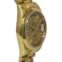 18kt yellow gold case with a 18kt yellow gold bracelet. Domed bezel. Champagne dial with gold-tone hands and index hour markers. Minute markers around the outer rim. Dial Type: Analog. Date display at the 3 o'clock position and day display at the 12 o'clock position. Automatic movement. Scratch resistant sapphire crystal. Screw-down crown. Solid case back. Case diameter: 36mm. Concealed crown clasp. Water resistant at 100 meters / 330 feet. Functions: date, day, hour, minute, second. Casual watch style. Watch label: Swiss Made. Rolex Day-Date Champagne Automatic 18kt Yellow Gold Ladies Watch118208CSP. GENERAL Color: Champagne / Gold / Yellow INFORMATION Brand: Rolex Series: Day-Date Collection Name: Day-Date Gender: Womens Model: 118208CSP Watch Label: Swiss Made Movement: Automatic Engine: Rolex Calibre 3155 Power Reserve: 48 hours CASE Case Size: 36 mm Case Material: 18kt Yellow Gold Case Shape: Round Case Back: Solid BAND Band Material: 18kt Yellow Gold Band Type: Bracelet Band Color: Yellow Gold-tone Clasp: Concealed Crown DIAL Dial Color: Champagne Type: Analog Crystal: Scratch Resistant Sapphire Hands: Gold-Tone Dial Markers: Index Second Markers: Minute Markers around the outer rim Bezel: Fixed Domed Bezel Material: 18kt Yellow Gold Crown: Screw Down FEATURES Water Resistance: 100 Meters / 330 Feet Calendar: Date display at the 3 o'clock position and day display at the 12 o'clock position Functions: Date, Day, Hour, Minute, Second, Chronometer Watch Features: Gold, Chronometer, Analog ADDITIONAL INFO Watch Style: Casual Warranty: 2 Year Jomashop Warranty Jomashop Sku: RLX118208CSP Department: Watches Category: Watches