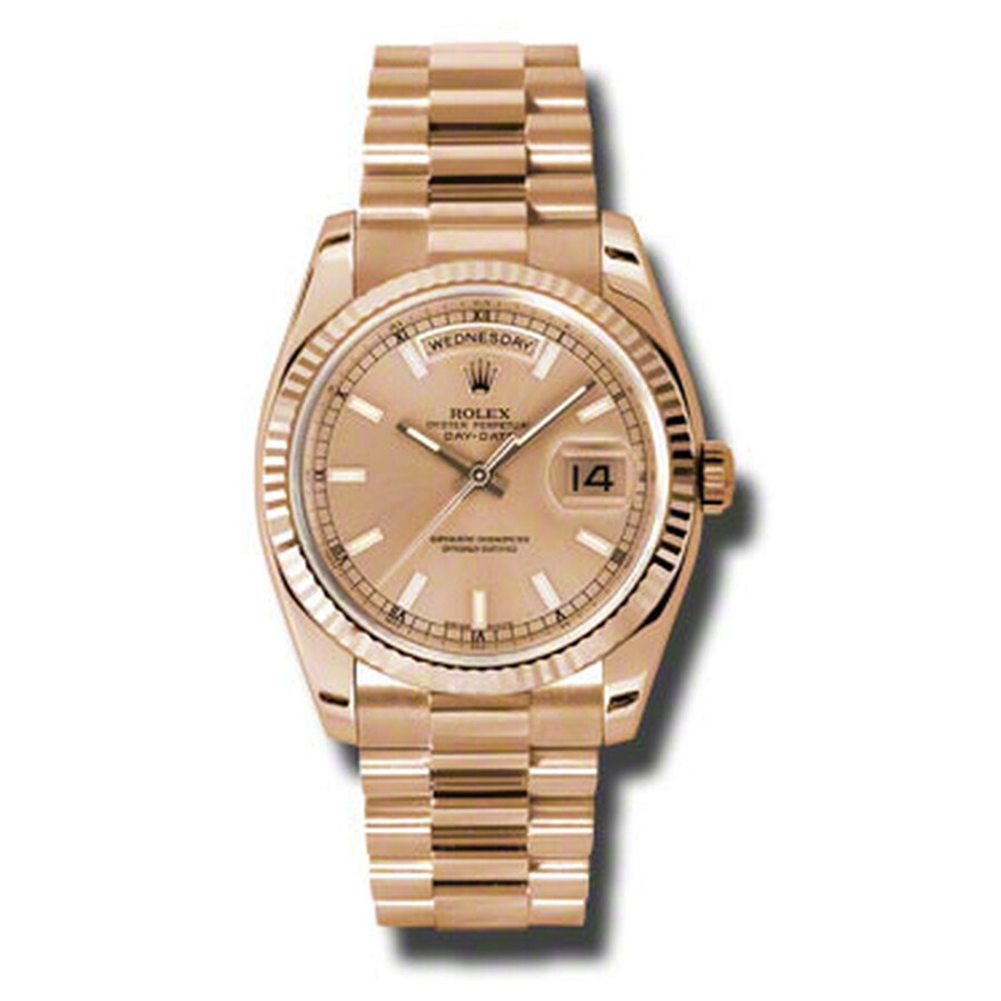 18k everose gold case with a 18k everose gold Rolex President bracelet. Fixed - fluted 18k everose gold bezel. Champagne dial with rose-gold tone hands and index hour markers. Minute markers around the outer rim. Dial Type: Analog. Date display at 3 o'clock; day display at 12 o'clock.. Automatic movement. Scratch resistant sapphire crystal. Screw down crown. Solid case back. Case diameter: 36 mm. Round case shape. Concealed Crown clasp. Water resistant at 100 meters / 330 feet. Functions: date, day, hour, minute, second. Luxury watch style. Watch label: Swiss Made. Rolex Day-Date Champagne Dial 18K Everose Gold President Automatic Men's Watch 118235CSP. GENERAL Color: Champagne / Gold / Rose CASE Case Size: 36 Case Material: 18kt Everose Gold Case Shape: Round Case Back: Solid BAND Band Material: 18kt Everose Gold Rolex President Band Type: Bracelet Band Color: Pink Gold-tone Clasp: Concealed Crown DIAL Dial Color: Champagne Type: Analog Crystal: Scratch Resistant Sapphire Hands: Rose-Gold Tone Dial Markers: Index Second Markers: Minute Markers around the outer rim Luminiscence: Hands and Markers Bezel: Fixed Fluted Bezel Material: 18kt Everose Gold Crown: Screw Down INFORMATION Brand: Rolex Series: Day-Date Collection Name: Day-Date Gender: Mens Model: 118235CSP Watch Label: Swiss Made Movement: Automatic Engine: Rolex Calibre 3155 Power Reserve: 48 hours FEATURES Water Resistance: 100 meters / 330 feet Calendar: Date display at 3 o'clock; Day Display at 12 o'clock. Functions: Date, Day, Hour, Minute, Second, Chronometer Watch Features: Gold, Chronometer, Analog ADDITIONAL INFO Watch Style: Luxury Warranty: 2 Year Jomashop Warranty UPC Code: 845960076333 Jomashop Sku: RLX118235CSP Department: Watches Category: Watches