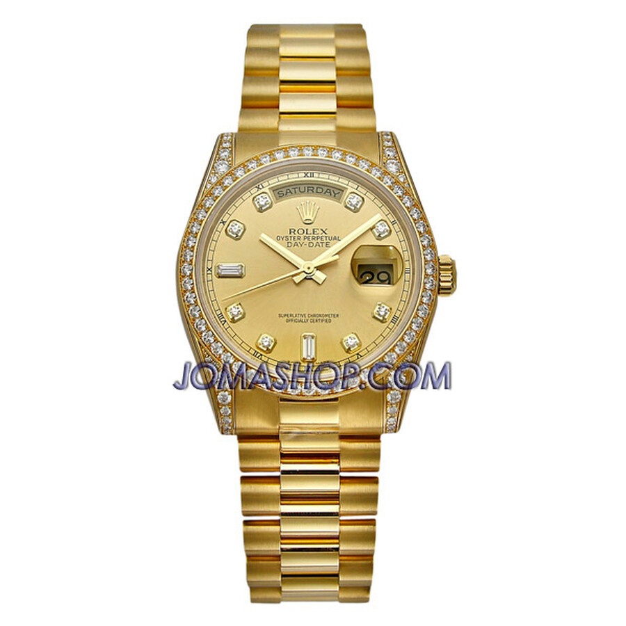 18k yellow gold case with a 18k yellow gold Rolex President bracelet. Fixed - 18k yellow gold diamond-set bezel. Champagne dial with yellow gold-tone hands and diamond hour markers. Dial Type: Analog. Date display at 3 o'clock; day display at 12 o'clock.. Automatic movement. Scratch resistant sapphire crystal. Screw down crown. Case diameter: 36 mm. Round case shape. Concealed Crown clasp. Water resistant at 100 meters / 330 feet. Functions: date, day, hour, minute, second. Additional Info: case lugs set with 32 diamonds, bezel set with 52 diamonds. Luxury watch style. Watch label: Swiss Made. Rolex Day-Date Champagne Dial 18K Yellow Gold President Automatic Men's Diamond Watch 118388CDP. GENERAL Color: Champagne / Gold / Yellow CASE Case Size: 36 Case Material: 18kt Yellow Gold Case Shape: Round Case Back: Solid BAND Band Material: 18kt Yellow Gold Rolex President Band Type: Bracelet Band Color: Gold Clasp: Concealed Crown DIAL Dial Color: Champagne Type: Analog Crystal: Scratch Resistant Sapphire Hands: Yellow Gold-Tone Dial Markers: Diamond Bezel: Fixed Bezel Color: 18kt Yellow Gold Bezel Material: Diamond Set Crown: Screw Down INFORMATION Brand: Rolex Series: Day-Date Collection Name: Day-Date Gender: Mens Model: 118388CDP Watch Label: Swiss Made Movement: Automatic Engine: Rolex Calibre 3155 Power Reserve: 48 hours FEATURES Water Resistance: 100 meters / 330 feet Calendar: Date display at 3 o'clock; Day Display at 12 o'clock. Functions: Date, Day, Hour, Minute, Second, Chronometer Watch Features: Diamond, Gold, Chronometer, Analog ADDITIONAL INFO Watch Style: Luxury Warranty: 2 Year Jomashop Warranty UPC Code: 845960076593 Additional Info: case lugs set with 32 diamonds, bezel set with 52 diamonds Jomashop Sku: RLX118388CDP Department: Watches Category: Watches