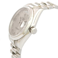 Platinum case with a platinum Rolex President bracelet. Fixed - domed platinum bezel. Grey dial with silver tone hands and Roman numeral hour markers. Dial Type: Analog. Date display at 3 o'clock; day display at 12 o'clock.. Automatic movement. Scratch resistant sapphire crystal. Screw down crown. Solid case back. Case diameter: 36 mm. Round case shape. Concealed Crown clasp. Water resistant at 100 meters / 330 feet. Functions: date, day, hour, minute, second. Luxury watch style. Watch label: Swiss Made. Rolex Day-Date Grey Dial Platinum President Automatic Men's Watch 118206GYRP. GENERAL Color: Grey / Platinum CASE Case Size: 36 Case Color: Grey Case Material: Platinum Case Shape: Round Case Back: Solid BAND Band Material: Platinum Rolex President Band Type: Bracelet Band Color: Grey Clasp: Concealed Crown DIAL Dial Color: Grey Type: Analog Crystal: Scratch Resistant Sapphire Hands: Silver tone Dial Markers: Roman Numeral Second Markers: Minute Markers around the outer rim Bezel: Fixed Domed Bezel Color: Grey Bezel Material: Platinum Crown: Screw Down INFORMATION Brand: Rolex Series: Day-Date Collection Name: Day-Date Gender: Mens Model: 118206GYRP Watch Label: Swiss Made Movement: Automatic Engine: Rolex Calibre 3155 Power Reserve: 48 hours FEATURES Water Resistance: 100 meters / 330 feet Calendar: Date display at 3 o'clock; Day Display at 12 o'clock. Functions: Date, Day, Hour, Minute, Second, Chronometer Watch Features: Chronometer, Platinum, Analog ADDITIONAL INFO Watch Style: Luxury Warranty: 2 Year Jomashop Warranty UPC Code: 845960076234 Jomashop Sku: RLX118206GYRP Department: Watches Category: Watches