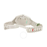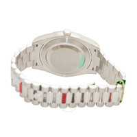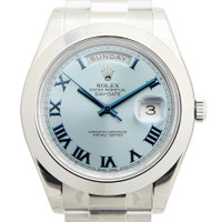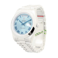 White platinum case with a white platinum rolex president bracelet. Fixed domed white platinum bezel. Ice blue dial with silver tone hands and Roman numeral hour markers. Minute markers around the outer rim. Dial Type: Analog. Date display at 3 o'clock; day display at 12 o'clock.. Rolex Calibre 3156 automatic movement with a 48-hour power reserve. Scratch resistant sapphire crystal. Screw down crown. Solid case back. Round case shape. Case size: 41 mm. Crown clasp. Water resistant at 100 meters / 330 feet. Functions: date, day, hour, minute, second, chronometer. Luxury watch style. Watch label: Swiss Made. Rolex Day-Date II Ice Blue Dial Platinum President Automatic Men's Watch 218206IBLRP. GENERAL Color: Blue / Platinum CASE Case Size: 41 Case Color: White Case Material: Platinum Case Shape: Round Case Back: Solid BAND Band Material: Platinum Rolex President Band Type: Bracelet Band Color: White Clasp: Crownclasp DIAL Dial Color: Ice Blue Type: Analog Crystal: Scratch Resistant Sapphire Hands: Silver tone Dial Markers: Roman Numeral Second Markers: Minute Markers around the outer rim Bezel: Fixed Domed Bezel Color: White Bezel Material: Platinum Crown: Screw Down INFORMATION Brand: Rolex Series: Day-Date Ii Collection Name: Day-Date II Gender: Mens Model: 218206IBLRP Watch Label: Swiss Made Movement: Automatic Engine: Rolex Calibre 3156 Power Reserve: 48 hours FEATURES Water Resistance: 100 meters / 330 feet Calendar: Date display at 3 o'clock; Day Display at 12 o'clock. Functions: Date, Day, Hour, Minute, Second, Chronometer Watch Features: Chronometer, Platinum, Analog ADDITIONAL INFO Watch Style: Luxury Warranty: 2 Year Jomashop Warranty UPC Code: 845960081481 Jomashop Sku: RLX218206IBLRP Department: Watches Category: Watches