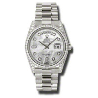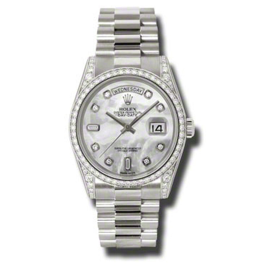18k white gold case with a 18k white gold Rolex President bracelet. Fixed - 18k white gold diamond-set bezel. Mother of pearl dial with silver-tone hands and diamond hour markers. Dial Type: Analog. Date display at 3 o'clock; day display at 12 o'clock.. Automatic movement. Scratch resistant sapphire crystal. Screw down crown. Solid case back. Case diameter: 36 mm. Round case shape. Concealed Crown clasp. Water resistant at 100 meters / 330 feet. Functions: date, day, hour, minute, second. Additional Info: diamonds set on lugs. Luxury watch style. Watch label: Swiss Made. Rolex Day-Date Mother Of Pearl Dial 18K White Gold President Automatic Ladies Diamond Watch 118389MDP. GENERAL Color: Gold / Mother of pearl / White INFORMATION Brand: Rolex Series: Day-Date Collection Name: Day-Date Gender: Womens Model: 118389MDP Watch Label: Swiss Made Movement: Automatic Engine: Rolex Calibre 3155 Power Reserve: 48 hours CASE Case Size: 36 mm Case Material: 18kt White Gold Case Shape: Round Case Back: Solid BAND Band Material: 18kt White Gold Rolex President Band Type: Bracelet Clasp: Concealed Crown DIAL Dial Color: Mother Of Pearl Type: Analog Crystal: Scratch Resistant Sapphire Hands: Silver-Tone Dial Markers: Diamond Bezel: Fixed Bezel Color: 18kt Yellow Gold Bezel Material: Diamond Set Crown: Screw Down FEATURES Water Resistance: 100 meters / 330 feet Calendar: Date display at 3 o'clock; Day Display at 12 o'clock. Functions: Date, Day, Hour, Minute, Second Watch Features: Diamond, Gold, Analog ADDITIONAL INFO Watch Style: Luxury Warranty: 2 Year Jomashop Warranty UPC Code: 845960076609 Additional Info: Diamonds Set on Lugs Jomashop Sku: RLX118389MDP Department: Watches Category: Watches