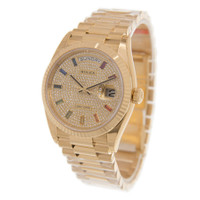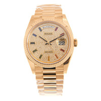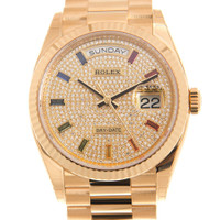 18kt yellow gold case with a gold-tone 18kt yellow gold rolex president bracelet. Fixed fluted 18kt yellow gold bezel. Diamond dial with diamond, 10 baguette-cut, rainbow-coloured sapphires hour markers. Dial Type: Analog. Date display at 3 o'clock; day display at 12 o'clock.. Rolex Calibre 3255 automatic movement with a 70-hour power reserve. Scratch resistant sapphire crystal. Screw down crown. Solid case back. Round case shape. Case size: 36 mm. Concealed crown clasp. Water resistant at 100 meters / 330 feet. Functions: date, day, hour, minute, second, chronometer. Luxury watch style. Watch label: Swiss Made. Rolex Day-Date Yellow Gold Paved-Rainbow Automatic Chronometer Diamond Ladies Watch 128238-0051. INFORMATION Brand: Rolex Series: Day-Date Collection Name: Day-Date Gender: Womens Model: 128238-0051 Watch Label: Swiss Made Movement: Automatic Engine: Rolex Calibre 3255 Power Reserve: 70 hours CASE Case Size: 36 mm Case Material: 18kt Yellow Gold Case Shape: Round Case Back: Solid BAND Band Material: 18kt Yellow Gold Rolex President Band Type: Bracelet Band Color: Gold-tone Clasp: Concealed Crown DIAL Dial Color: Diamond Type: Analog Crystal: Scratch Resistant Sapphire Dial Markers: Diamond, 10 baguette-cut, rainbow-coloured sapphires Bezel: Fixed fluted Bezel Material: 18kt Yellow Gold Crown: Screw Down FEATURES Water Resistance: 100 meters / 330 feet Calendar: Date display at 3 o'clock; Day Display at 12 o'clock. Functions: Date, Day, Hour, Minute, Second, Chronometer Watch Features: Diamond, Gold, Chronometer, Analog ADDITIONAL INFO Watch Style: Luxury Warranty: 2 Year Jomashop Warranty Jomashop Sku: RLX1282380051 Item Variation: M128238-0051 Department: Watches Category: Watches