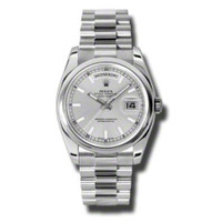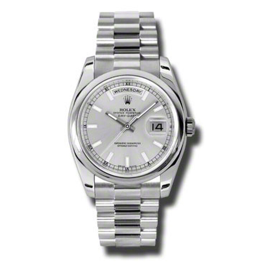 Platinum case with a platinum Rolex President bracelet. Fixed - domed platinum bezel. Silver dial with silver tone hands and index hour markers. Minute markers around the outer rim. Dial Type: Analog. Date display at 3 o'clock; day display at 12 o'clock.. Automatic movement. Scratch resistant sapphire crystal. Screw down crown. Solid case back. Case diameter: 36 mm. Round case shape. Concealed Crown clasp. Water resistant at 100 meters / 330 feet. Functions: date, day, hour, minute, second. Luxury watch style. Watch label: Swiss Made. Rolex Day-Date Silver Dial Platinum President Automatic Men's Watch 118206SSP. GENERAL Color: Platinum / Silver CASE Case Size: 36 Case Color: Grey Case Material: Platinum Case Shape: Round Case Back: Solid BAND Band Material: Platinum Rolex President Band Type: Bracelet Band Color: Grey Clasp: Concealed Crown DIAL Dial Color: Silver Type: Analog Crystal: Scratch Resistant Sapphire Hands: Silver tone Dial Markers: Index Second Markers: Minute Markers around the outer rim Luminiscence: Hands and Markers Bezel: Fixed Domed Bezel Color: Grey Bezel Material: Platinum Crown: Screw Down INFORMATION Brand: Rolex Series: Day-Date Collection Name: Day-Date Gender: Mens Model: 118206SSP Watch Label: Swiss Made Movement: Automatic Engine: Rolex Calibre 3155 Power Reserve: 48 hours FEATURES Water Resistance: 100 meters / 330 feet Calendar: Date display at 3 o'clock; Day Display at 12 o'clock. Functions: Date, Day, Hour, Minute, Second, Chronometer Watch Features: Chronometer, Platinum, Analog ADDITIONAL INFO Watch Style: Luxury Warranty: 2 Year Jomashop Warranty UPC Code: 845960076265 Jomashop Sku: RLX118206SSP Department: Watches Category: Watches