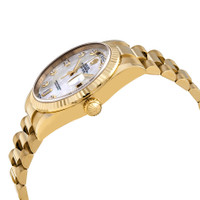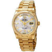 18kt yellow gold case with a 18kt yellow gold rolex president bracelet. Fixed fluted 18kt yellow gold bezel. White mother-of-pearl dial with yellow gold-tone hands and diamond hour markers. Dial Type: Analog. Date display at 3 o'clock; day display at 12 o'clock.. Rolex Calibre 3155 automatic movement with a 48-hour power reserve. Scratch resistant sapphire crystal. Screw down crown. Solid case back. Round case shape. Case size: 36 mm. Concealed crown clasp. Water resistant at 100 meters / 330 feet. Functions: date, day, hour, minute, second, chronometer. Luxury watch style. Watch label: Swiss Made. Item Variations: 118238, 118238-MDP , Rolex-118238, Rolex-118238-MDP 118238, 118238-MDP, Rolex-11. Rolex Day-Date White Mother-Of-Pearl Dial 18K Yellow Gold President Automatic Men's Watch 118238MDP. GENERAL Color: Gold / Mother of pearl / White / Yellow CASE Case Size: 36 Case Material: 18kt Yellow Gold Case Shape: Round Case Back: Solid BAND Band Material: 18kt Yellow Gold Rolex President Band Type: Bracelet Clasp: Concealed Crown DIAL Dial Color: White Mother-Of-Pearl Type: Analog Crystal: Scratch Resistant Sapphire Hands: Yellow Gold-Tone Dial Markers: Diamond Bezel: Fixed fluted Bezel Material: 18kt Yellow Gold Crown: Screw Down INFORMATION Brand: Rolex Series: Day-Date Collection Name: Day-Date Gender: Mens Model: 118238MDP Watch Label: Swiss Made Movement: Automatic Engine: Rolex Calibre 3155 Power Reserve: 48 hours FEATURES Water Resistance: 100 meters / 330 feet Calendar: Date display at 3 o'clock; Day Display at 12 o'clock. Functions: Date, Day, Hour, Minute, Second, Chronometer Watch Features: Diamond, Gold, Chronometer, Analog ADDITIONAL INFO Watch Style: Luxury Warranty: 2 Year Jomashop Warranty UPC Code: 845960083751 Jomashop Sku: RLX118238MDP Item Variation: 118238, 118238-MDP , Rolex-118238, Rolex-118238-MDP 118238, 118238-MDP, Rolex-11 Department: Watches Category: Watches
