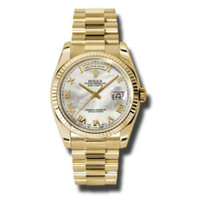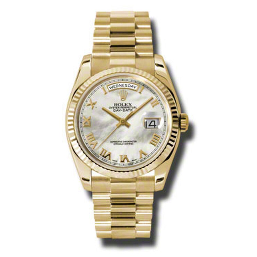 18kt yellow gold case with a 18kt yellow gold rolex president bracelet. Fixed fluted 18kt yellow gold bezel. White mother-of-pearl dial with yellow gold-tone hands and Roman numeral hour markers. Dial Type: Analog. Date display at 3 o'clock; day display at 12 o'clock.. Rolex Calibre 3155 automatic movement with a 48-hour power reserve. Scratch resistant sapphire crystal. Screw down crown. Solid case back. Round case shape. Case size: 36 mm. Concealed crown clasp. Water resistant at 100 meters / 330 feet. Functions: date, day, hour, minute, second, chronometer. Luxury watch style. Watch label: Swiss Made. Item Variations: 118238, 118238-MRP , Rolex-118238, Rolex-118238-MRP 118238, 118238-MRP, Rolex-11. Rolex Day-Date White Mother-Of-Pearl Dial 18K Yellow Gold President Automatic Men's Watch 118238MRP. GENERAL Color: Gold / Mother of pearl / White / Yellow CASE Case Size: 36 Case Material: 18kt Yellow Gold Case Shape: Round Case Back: Solid BAND Band Material: 18kt Yellow Gold Rolex President Band Type: Bracelet Clasp: Concealed Crown DIAL Dial Color: White Mother-Of-Pearl Type: Analog Crystal: Scratch Resistant Sapphire Hands: Yellow Gold-Tone Dial Markers: Roman Numeral Second Markers: Minute Markers around the outer rim Bezel: Fixed fluted Bezel Material: 18kt Yellow Gold Crown: Screw Down INFORMATION Brand: Rolex Series: Day-Date Collection Name: Day-Date Gender: Mens Model: 118238MRP Watch Label: Swiss Made Movement: Automatic Engine: Rolex Calibre 3155 Power Reserve: 48 hours FEATURES Water Resistance: 100 meters / 330 feet Calendar: Date display at 3 o'clock; Day Display at 12 o'clock. Functions: Date, Day, Hour, Minute, Second, Chronometer Watch Features: Gold, Chronometer, Analog ADDITIONAL INFO Watch Style: Luxury Warranty: 2 Year Jomashop Warranty UPC Code: 845960083768 Jomashop Sku: RLX118238MRP Item Variation: 118238, 118238-MRP , Rolex-118238, Rolex-118238-MRP 118238, 118238-MRP, Rolex-11 Department: Watches Category: Watches