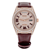Rose gold-tone diamond set case with a burgandy crocodile leather strap. Fixed bezel with diamond set. Diamonds dial with rose gold-tone hands and Roman numeral hour markers. Dial Type: Analog. Date display at the 3 o'clock position, day display at the 12 o'clock position. Automatic movement with a 70-hour power reserve. Scratch resistant sapphire crystal. Screw down crown. Solid case back. Round case shape, case size: 36 mm. Fold over clasp. Water resistant at 100 meters / 330 feet. Functions: chronograph, hour, minute, second. Daydate Series. Dress watch style. Watch label: Swiss Made. Item Variations: M128155RBR-0002, 128155RBR-0002. Rolex Daydate Chronograph Automatic Diamond Ladies Watch M128155RBR-0002. CASE Case Size: 36 Case Material: Diamond Set Case Shape: Round Case Back: Solid BAND Band Material: Crocodile Leather Band Type: Strap Band Color: Burgandy Clasp: Fold Over DIAL Dial Color: Diamonds Type: Analog Crystal: Scratch Resistant Sapphire Hands: Rose Gold-tone Dial Markers: Roman Numeral Bezel: Fixed Bezel Material: Diamond Set Crown: Screw Down INFORMATION Brand: Rolex Series: Daydate Collection Name: Daydate Gender: Womens Model: M128155RBR-0002 Watch Label: Swiss Made Movement: Automatic Power Reserve: 70 hours FEATURES Water Resistance: 100 meters / 330 feet Calendar: Date display at the 3 o'clock position, Day display at the 12 o'clock position Functions: Chronograph, Hour, Minute, Second Watch Features: Diamond, Chronograph, Leather, Gold, Analog ADDITIONAL INFO Watch Style: Dress Warranty: 2 Year Jomashop Warranty Jomashop Sku: RLX128155RBR-0002 Item Variation: M128155RBR-0002, 128155RBR-0002 Department: Watches