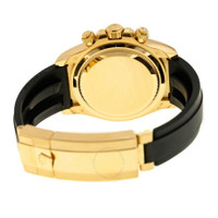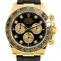 Yellow gold-tone 18kt yellow gold case with a black rubber strap. Fixed tachymeter scale black cerachrom bezel. Black dial with yellow gold-tone hands and diamond hour markers. Minute markers around the outer rim. Dial Type: Analog. Luminescent hands and markers. Chronograph - three sub-dials displaying: 60 second, 30 minute and 12 hour. Rolex Calibre 4131 automatic movement with a 72-hour power reserve. Scratch resistant sapphire crystal. Screw down crown. Solid case back. Round case shape, case size: 40 mm. Fold over clasp with a safety release. Water resistant at 100 meters / 330 feet. Functions: chronograph, hour, minute, second. Additional Info: original box, manual (complete accessories). Daytona Series. Luxury watch style. Watch label: Swiss Made. Rolex Daytona Chronograph Automatic Diamond Black Dial Men's Watch 126518LN-0006. CASE Case Size: 40 Case Material: 18kt Yellow Gold Case Shape: Round Case Back: Solid BAND Band Material: Rubber Band Type: Strap Band Color: Black Clasp: Fold Over with Safety Release DIAL Dial Color: Black Type: Analog Crystal: Scratch Resistant Sapphire Hands: Yellow Gold-tone Dial Markers: Diamond Second Markers: Minute Markers around the outer rim Sub Dials: Three - 60 Second, 30 Minute and 12 Hour Luminiscence: Hands and Markers Bezel: Fixed Tachymeter Scale Bezel Color: Black Bezel Material: Cerachrom Crown: Screw Down INFORMATION Brand: Rolex Series: Daytona Collection Name: Daytona Gender: Mens Model: 126518LN-0006 Watch Label: Swiss Made Movement: Automatic Engine: Rolex Calibre 4131 Power Reserve: 72 hours FEATURES Water Resistance: 100 meters / 330 feet Functions: Chronograph, Hour, Minute, Second Watch Features: Diamond, Chronograph, Rubber, Gold, Analog ADDITIONAL INFO Watch Style: Luxury Warranty: 2 Year Jomashop Warranty Additional Info: Original Box, Manual (Complete Accessories) Jomashop Sku: RLX126518BKDR Department: Watches Category: Watches