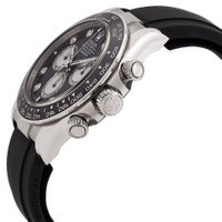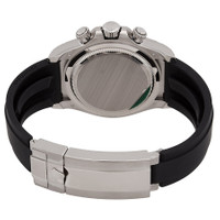 18kt white gold case with a black rubber strap. Fixed tachymeter scale black cerachrom bezel. Black dial with silver-tone hands and diamond hour markers. Minute markers around the outer rim. Dial Type: Analog. Luminescent hands and markers. Chronograph - three sub-dials displaying: 60 second, 30 minute and 12 hour. Rolex Calibre 4131 automatic movement with a 72-hour power reserve. Scratch resistant sapphire crystal. Screw down crown. Solid case back. Round case shape, case size: 40 mm. Fold over clasp with a safety release. Water resistant at 100 meters / 330 feet. Functions: chronograph, hour, minute, second. Additional Info: original box, manual (complete accessories). Daytona Series. Luxury watch style. Watch label: Swiss Made. Rolex Daytona Chronograph Automatic Diamond Black Dial Men's Watch 126519LN-0004. CASE Case Size: 40 Case Material: 18kt White Gold Case Shape: Round Case Back: Solid BAND Band Material: Rubber Band Type: Strap Band Color: Black Clasp: Fold Over with Safety Release DIAL Dial Color: Black Type: Analog Crystal: Scratch Resistant Sapphire Hands: Silver-tone Dial Markers: Diamond Second Markers: Minute Markers around the outer rim Sub Dials: Three - 60 Second, 30 Minute and 12 Hour Luminiscence: Hands and Markers Bezel: Fixed Tachymeter Scale Bezel Color: Black Bezel Material: Cerachrom Crown: Screw Down INFORMATION Brand: Rolex Series: Daytona Collection Name: Daytona Gender: Mens Model: 126519LN-0004 Watch Label: Swiss Made Movement: Automatic Engine: Rolex Calibre 4131 Power Reserve: 72 hours FEATURES Water Resistance: 100 meters / 330 feet Functions: Chronograph, Hour, Minute, Second Watch Features: Diamond, Chronograph, Rubber, Gold, Analog ADDITIONAL INFO Watch Style: Luxury Warranty: 2 Year Jomashop Warranty Additional Info: Original Box, Manual (Complete Accessories) Jomashop Sku: RLX126519BKDR Department: Watches Category: Watches