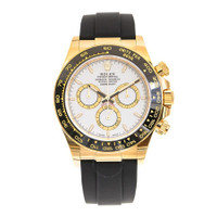 Yellow gold-tone 18kt yellow gold case with a black rubber strap. Fixed tachymeter scale black cerachrom bezel. White dial with yellow gold-tone hands and index hour markers. Minute markers around the outer rim. Dial Type: Analog. Luminescent hands and markers. Chronograph - three sub-dials displaying: 60 second, 30 minute and 12 hour. Rolex Calibre 4131 automatic movement with a 72-hour power reserve. Scratch resistant sapphire crystal. Screw down crown. Solid case back. Round case shape, case size: 40 mm. Fold over clasp with a safety release. Water resistant at 100 meters / 330 feet. Functions: chronograph, hour, minute, second. Additional Info: original box, manual (complete accessories). Daytona Series. Luxury watch style. Watch label: Swiss Made. Rolex Daytona Chronograph Automatic White Dial Men's Watch 126518LN-0002. CASE Case Size: 40 Case Material: 18kt Yellow Gold Case Shape: Round Case Back: Solid BAND Band Material: Rubber Band Type: Strap Band Color: Black Clasp: Fold Over with Safety Release DIAL Dial Color: White Type: Analog Crystal: Scratch Resistant Sapphire Hands: Yellow Gold-tone Dial Markers: Index Second Markers: Minute Markers around the outer rim Sub Dials: Three - 60 Second, 30 Minute and 12 Hour Luminiscence: Hands and Markers Bezel: Fixed Tachymeter Scale Bezel Color: Black Bezel Material: Cerachrom Crown: Screw Down INFORMATION Brand: Rolex Series: Cosmograph Daytona Collection Name: Daytona Gender: Mens Model: 126518LN-0002 Watch Label: Swiss Made Movement: Automatic Engine: Rolex Calibre 4131 Power Reserve: 72 hours FEATURES Water Resistance: 100 meters / 330 feet Functions: Chronograph, Hour, Minute, Second Watch Features: Analog, Gold, Rubber, Chronograph ADDITIONAL INFO Watch Style: Luxury Warranty: 2 Year Jomashop Warranty Additional Info: Original Box, Manual (Complete Accessories) Jomashop Sku: RLX126518WSR Department: Watches Category: Watches