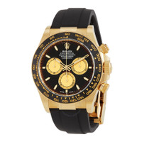 Yellow gold-tone 18kt yellow gold case with a black rubber strap. Fixed tachymeter scale black cerachrom bezel. Black dial with yellow gold-tone hands and index hour markers. Minute markers around the outer rim. Dial Type: Analog. Luminescent hands and markers. Chronograph - three sub-dials displaying: 60 second, 30 minute and 12 hour. Rolex Calibre 4131 automatic movement with a 72-hour power reserve. Scratch resistant sapphire crystal. Screw down crown. Solid case back. Round case shape, case size: 40 mm. Fold over clasp with a safety release. Water resistant at 100 meters / 330 feet. Functions: chronograph, hour, minute, second. Additional Info: original box, manual (complete accessories). Daytona Series. Luxury watch style. Watch label: Swiss Made. Rolex Daytona Chronograph Automatic Black Dial Men's Watch 126518LN-0004. CASE Case Size: 40 Case Material: 18kt Yellow Gold Case Shape: Round Case Back: Solid BAND Band Material: Rubber Band Type: Strap Band Color: Black Clasp: Fold Over with Safety Release DIAL Dial Color: Black Type: Analog Crystal: Scratch Resistant Sapphire Hands: Yellow Gold-tone Dial Markers: Index Second Markers: Minute Markers around the outer rim Sub Dials: Three - 60 Second, 30 Minute and 12 Hour Luminiscence: Hands and Markers Bezel: Fixed Tachymeter Scale Bezel Color: Black Bezel Material: Cerachrom Crown: Screw Down INFORMATION Brand: Rolex Series: Daytona Collection Name: Daytona Gender: Mens Model: 126518LN-0004 Watch Label: Swiss Made Movement: Automatic Engine: Rolex Calibre 4131 Power Reserve: 72 hours FEATURES Water Resistance: 100 meters / 330 feet Functions: Chronograph, Hour, Minute, Second Watch Features: Chronograph, Rubber, Gold, Analog ADDITIONAL INFO Watch Style: Luxury Warranty: 2 Year Jomashop Warranty Additional Info: Original Box, Manual (Complete Accessories) Jomashop Sku: RLX126518CBKSR Department: Watches Category: Watches