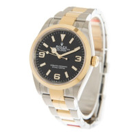 Stainless steel case with a stainless steel oyster bracelet with yellow gold center links. Fixed 18kt yellow gold bezel. Black dial with luminous yellow gold-tone hands and index hour markers. Arabic numerals appear at the 3, 6 and 9 o'clock positions. Minute markers around the outer rim. Dial Type: Analog. Luminescent hands and markers. Rolex calibre 3230 automatic movement, containing 31 Jewels, bitting at 28800 vph, and has a power reserve of approximately 70 hours. Scratch resistant sapphire crystal. Screw down crown. Solid case back. Round case shape. Case size: 36 mm. Oysterlock clasp. Water resistant at 100 meters / 330 feet. Functions: hour, minute, second, chronometer. Explorer Series. Luxury watch style. Watch label: Swiss Made. Item Variations: m124273-0001. Rolex Explorer Automatic Chronometer Black Dial Men's Watch 124273BKASO. CASE Case Size: 36 Case Material: Stainless Steel Case Shape: Round Case Back: Solid BAND Band Material: Stainless Steel with Yellow Gold Oyster Links Band Type: Bracelet Band Color: Silver-tone Clasp: Oysterlock DIAL Dial Color: Black Type: Analog Crystal: Scratch Resistant Sapphire Hands: Luminous Yellow Gold-tone Dial Markers: Index Second Markers: Arabic Numerals appear at the 3, 6 and 9 o'clock positions. Minute Markers around the outer rim Luminiscence: Hands and Markers Bezel: Fixed Bezel Color: Yellow Gold-tone Bezel Material: 18kt Yellow Gold Crown: Screw Down INFORMATION Brand: Rolex Series: Explorer Collection Name: Explorer Gender: Mens Model: M124273-0001 Watch Label: Swiss Made Movement: Automatic Engine: Rolex Calibre 3230 Power Reserve: 70 hours FEATURES Water Resistance: 100 meters / 330 feet Functions: Hour, Minute, Second, Chronometer Watch Features: Stainless Steel, Gold, Chronometer, Analog ADDITIONAL INFO Watch Style: Luxury Warranty: 2 Year Jomashop Warranty Jomashop Sku: RLX124273BKASO Item Variation: 124273-0001, 124273BKASO Department: Watches Category: Watches