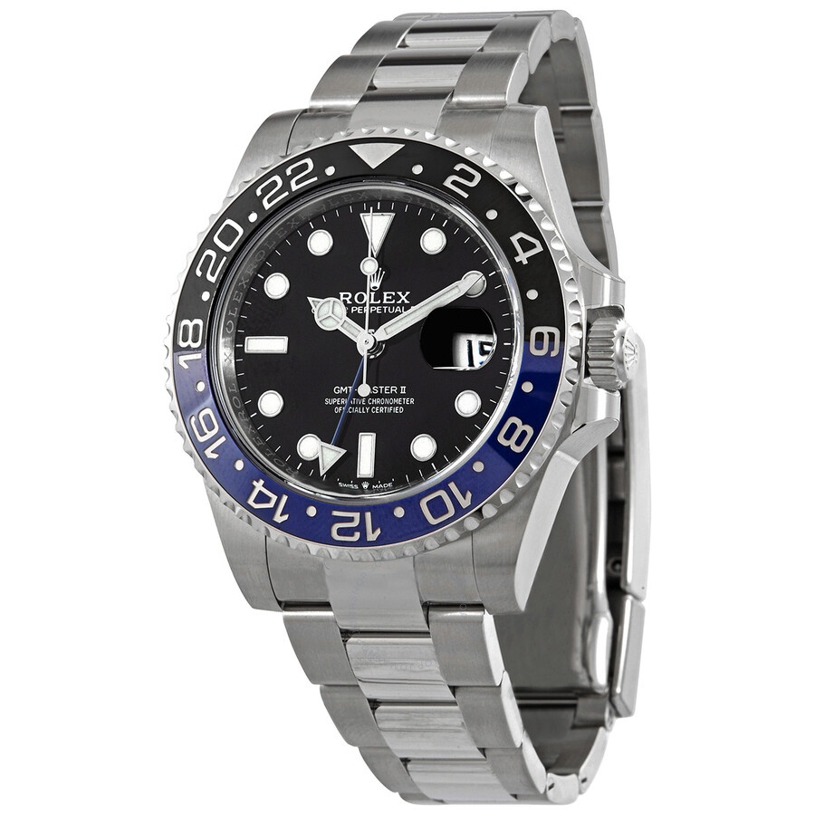 Silver-tone stainless steel case with a silver-tone stainless steel rolex oyster bracelet. Bi-directional rotating Batman stainless steel with an inlaid black and blue cerachrom ring bezel. Black dial with luminous silver-tone hands and dot hour markers. Minute markers around the outer rim. Dial Type: Analog. Luminescent hands and markers. Date display at the 3 o'clock position. Rolex Calibre 3285 Automatic movement, based upon Rolex 3255, containing 31 Jewels, bitting at 28800 vph, and has a power reserve of approximately 70 hours. Scratch resistant sapphire crystal. Screw down crown. Solid case back. Round case shape, case size: 40 mm. Band width: 20 mm. Fold over oysterlock clasp. Water resistant at 100 meters / 330 feet. Functions: date, hour, minute, second, 24 hours, GMT. Additional Info: m126710blnr-0003. Gmt-master II Series. Luxury watch style. Watch label: Swiss Made. Item Variations: M126710BLNR-0003. Rolex GMT-Master II Automatic Black Dial Batman Bezel Men's Watch 126710BKBLSO. INFORMATION Brand: Rolex Series: Gmt-Master Ii Collection Name: GMT-Master II Gender: Mens Model: 126710BKBLSO Watch Label: Swiss Made Movement: Automatic Engine: Rolex Calibre 3285 Power Reserve: 70 hours CASE Case Size: 40 mm Case Material: Stainless Steel Case Shape: Round Case Back: Solid BAND Band Material: Stainless Steel Rolex Oyster Band Type: Bracelet Band Color: Silver-tone Band Width: 20 mm Clasp: Fold Over Oysterlock DIAL Dial Color: Black Type: Analog Crystal: Scratch Resistant Sapphire Hands: Luminous Silver-tone Dial Markers: Dot Second Markers: Minute Markers around the outer rim Luminiscence: Hands and Markers Bezel: Bi-directional Rotating Bezel Color: Batman Bezel Material: Stainless Steel with an inlaid Black and Blue Cerachrom Ring Crown: Screw Down FEATURES Water Resistance: 100 meters / 330 feet Calendar: Date display at the 3 o'clock position Functions: Date, Hour, Minute, Second, 24 Hours, GMT Watch Features: Stainless Steel, GMT, Analog ADDITIONAL INFO Watch Style: Luxury Warranty: 2 Year Jomashop Warranty Additional Info: M126710BLNR-0003 Jomashop Sku: RLX126710BKBLSO Item Variation: M126710BLNR-0003 Department: Watches Category: Watches