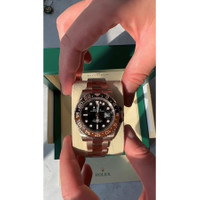 18kt everose gold case with a 18kt everose gold rolex oyster bracelet. Bi-directional rotating black and brown (root beer) 18kt everose gold bezel. Black dial with luminous everose gold hands and dot hour markers. Minute markers around the outer rim. Dial Type: Analog. Luminescent hands and markers. Date display at the 3 o'clock position. Rolex Calibre 3285 Automatic movement, based upon Rolex 3255, containing 31 Jewels, bitting at 28800 vph, and has a power reserve of approximately 70 hours. Scratch resistant sapphire crystal. Screw down crown. Solid case back. Round case shape, case size: 40 mm. Oysterlock clasp. Water resistant at 100 meters / 330 feet. Functions: date, hour, minute, second, 24 hours, GMT. Gmt-master II Series. Luxury watch style. Watch label: Swiss Made. Item Variations: 126715chnr-0001, 126715chnr. Rolex GMT-Master II Automatic Men's 18kt Everose Gold Oyster Root Beer Bezel Watch 126715BKSO. INFORMATION Brand: Rolex Series: Gmt-Master Ii Collection Name: GMT-Master II Gender: Mens Model: 126715CHNR-0001 Watch Label: Swiss Made Movement: Automatic Engine: Rolex Calibre 3285 Power Reserve: 70 hours CASE Case Size: 40 mm Case Material: 18kt Everose Gold Case Shape: Round Case Back: Solid BAND Band Material: 18kt Everose Gold Rolex Oyster Band Type: Bracelet Clasp: Oysterlock DIAL Dial Color: Black Type: Analog Crystal: Scratch Resistant Sapphire Hands: Luminous Everose Gold Dial Markers: Dot Second Markers: Minute Markers around the outer rim Luminiscence: Hands and Markers Bezel: Bi-directional Rotating Bezel Color: Black and Brown (Root Beer) Bezel Material: 18kt Everose Gold Crown: Screw Down FEATURES Water Resistance: 100 meters / 330 feet Calendar: Date display at the 3 o'clock position Functions: Date, Hour, Minute, Second, 24 Hours, GMT Watch Features: Gold, GMT, Analog ADDITIONAL INFO Watch Style: Luxury Warranty: 2 Year Jomashop Warranty UPC Code: 842047146675 Jomashop Sku: RLX126715BKSO Item Variation: 126715chnr-0001, 126715chnr Department: Watches Category: Watches