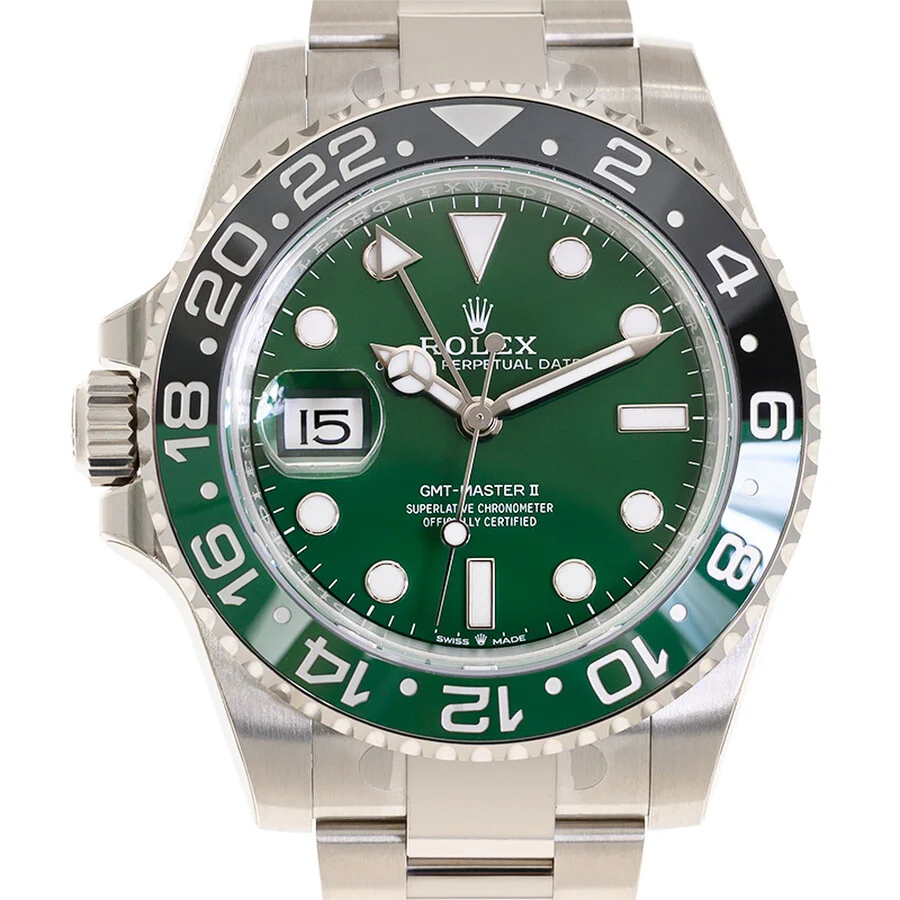 18kt white gold case with a 18kt white gold oyster bracelet. Bi-directional rotating green and black cerachrom insert in ceramic bezel. Green ceramic dial with silver-tone hands and index hour markers. Minute markers around the outer rim. Dial Type: Analog. Luminescent chromalight. Date display at the 9 o'clock position. Rolex Calibre 3285 Automatic movement, based upon Rolex 3255, containing 31 Jewels, bitting at 28800 vph, and has a power reserve of approximately 70 hours. Scratch resistant sapphire crystal. Screw down crown. Solid case back. Round case shape, case size: 40 mm. Oysterlock clasp. Water resistant at 100 meters / 330 feet. Functions: date, GMT, second time zone, hour, minute, second, chronometer. Gmt Master II Series. Luxury watch style. Watch label: Swiss Made. Item Variations: 126729VTNR-0001. Rolex Gmt Master Ii GMT Automatic Chronometer Men's Watch M126729VTNR-0001. GENERAL Box Type: Original Box CASE Case Diameter: 40 mm Case Material: 18kt White Gold Case Shape: Round Case Back: Solid BAND Band Material: 18kt White Gold Oyster Band Type: Bracelet Clasp: Oysterlock DIAL Dial Color: Green Ceramic Type: Analog Crystal: Scratch Resistant Sapphire Hands: Silver-tone Dial Markers: Index Second Markers: Minute Markers around the outer rim Luminiscence: Chromalight Bezel: Bi-directional Rotating Bezel Color: Green and Black Bezel Material: Cerachrom Insert In Ceramic Crown: Screw Down INFORMATION Brand: Rolex Series: Gmt Master Ii Collection Name: GMT-Master II Gender: Mens Model: M126729VTNR-0001 Watch Label: Swiss Made Movement: Automatic Engine: Rolex Calibre 3285 Power Reserve: 70 hours FEATURES Water Resistance: 100 meters / 330 feet Calendar: Date display at the 9 o'clock position Functions: Date, GMT, Second Time Zone, Hour, Minute, Second, Chronometer Watch Features: Analog, GMT, Chronometer, Ceramic, Gold, Time Zone ADDITIONAL INFO Watch Style: Luxury Warranty: 2 Year Jomashop Warranty Jomashop Sku: RLX126729VTNR-0001 Item Variation: 126729VTNR-0001 Department: Watches Category: Watches