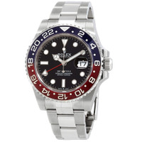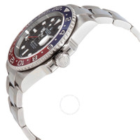 Stainless steel case with a stainless steel Rolex oyster bracelet. Bi-directional rotating stainless steel bezel with an inlaid red and blue cerachrom ring. Black dial with luminous silver-tone hands and dot hour markers. Minute markers around the outer rim. Dial Type: Analog. Luminescent hands and markers. Date display at the 3 o'clock position. Rolex calibre 3285 automatic movement, based upon Rolex 3255, containing 31 Jewels, bitting at 28800 vph, and has a power reserve of approximately 70 hours. Scratch resistant sapphire crystal. Screw down crown. Solid case back. Round case shape. Case size: 40 mm. Folding oysterlock clasp. Water resistant at 100 meters / 330 feet. Functions: date, hour, minute, second, 24 hours, GMT. Additional Info: 126710blro-0001, m126710blro-0001. GMT-master II Series. Luxury watch style. Watch label: Swiss Made. Rolex GMT-Master II "Pepsi" Automatic Black Dial Men's Watch 126710BKSO. INFORMATION Brand: Rolex Series: Gmt-Master Ii Collection Name: GMT-Master II Gender: Mens Model: 126710BKSO Watch Label: Swiss Made Movement: Automatic Engine: Rolex Calibre 3285 Power Reserve: 70 hours CASE Case Size: 40 mm Case Material: Stainless Steel Case Shape: Round Case Back: Solid BAND Band Material: Stainless Steel Rolex Oyster Band Type: Bracelet Band Color: Silver-tone Clasp: Folding Oysterlock DIAL Dial Color: Black Type: Analog Crystal: Scratch Resistant Sapphire Hands: Luminous Silver-tone Dial Markers: Dot Second Markers: Minute Markers around the outer rim Luminiscence: Hands and Markers Bezel: Bi-directional Rotating Bezel Color: Silver-tone Bezel Material: Stainless Steel with an inlaid Red and Blue Cerachrom Ring Crown: Screw Down FEATURES Water Resistance: 100 meters / 330 feet Calendar: Date display at the 3 o'clock position Functions: Date, Hour, Minute, Second, 24 Hours, GMT Watch Features: Stainless Steel, GMT, Analog ADDITIONAL INFO Watch Style: Luxury Warranty: 2 Year Jomashop Warranty Jomashop Sku: RLX126710BKSO Item Variation: 126710blro-0001, m126710blro-0001, m126710BLRO-0002 Department: Watches Category: Watches