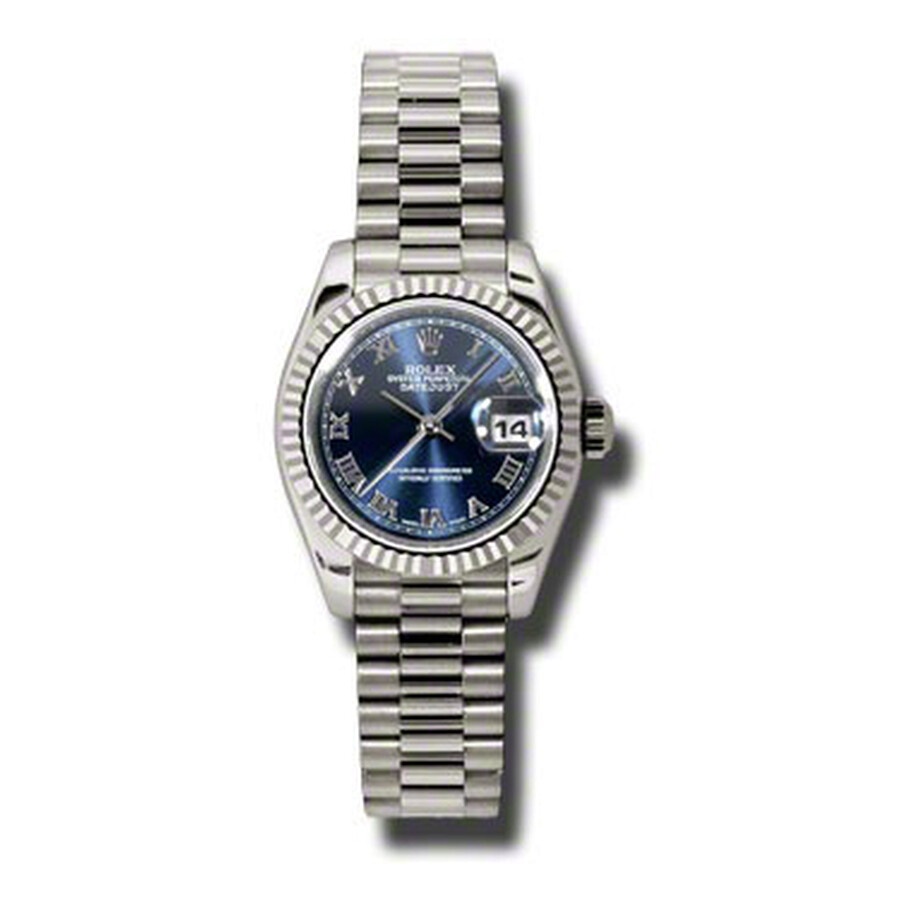 18k white gold case with a 18k white gold Rolex President bracelet. Fixed - fluted 18k white gold bezel. Black dial with silver-tone hands and Roman numeral hour markers. Minute markers around the outer rim. Dial Type: Analog. Date display at the 3 o'clock position. Automatic movement. Scratch resistant sapphire crystal. Screw down crown. Solid case back. Case diameter: 26 mm. Round case shape. Concealed Crown clasp. Water resistant at 100 meters / 330 feet. Functions: date, hour, minute, second. Luxury watch style. Watch label: Swiss Made. Rolex Lady-Datejust 26 Black Dial 18K White Gold President Automatic Ladies Watch 179179BLRP. GENERAL Color: Black / Gold / White INFORMATION Brand: Rolex Series: Datejust Collection Name: Lady Datejust Gender: Womens Model: 179179BLRP Watch Label: Swiss Made Movement: Automatic Engine: Rolex Calibre 2235 Power Reserve: 48 hours CASE Case Size: 26 mm Case Material: 18kt White Gold Case Shape: Round Case Back: Solid BAND Band Material: 18kt White Gold Rolex President Band Type: Bracelet Band Color: White Gold-tone Clasp: Concealed Crown DIAL Dial Color: Black Type: Analog Crystal: Scratch Resistant Sapphire Hands: Silver-Tone Dial Markers: Roman Numeral Second Markers: Minute Markers around the outer rim Bezel: Fixed Fluted Bezel Material: 18kt White Gold Crown: Screw Down FEATURES Water Resistance: 100 meters / 330 feet Calendar: Date display at the 3 o'clock position Functions: Date, Hour, Minute, Second, Chronometer Watch Features: Gold, Chronometer, Analog ADDITIONAL INFO Watch Style: Luxury Warranty: 2 Year Jomashop Warranty UPC Code: 845960081122 Jomashop Sku: RLX179179BLRP Department: Watches Category: Watches