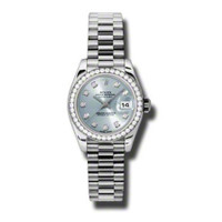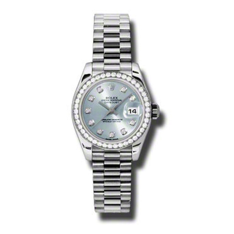 Platinum case with a platinum Rolex President bracelet. Fixed - platinum diamond-set bezel. Ice blue dial with silver tone hands and diamond hour markers. Dial Type: Analog. Date display at the 3 o'clock position. Automatic movement. Scratch resistant sapphire crystal. Screw down crown. Solid case back. Case diameter: 26 mm. Round case shape. Concealed Crown clasp. Water resistant at 100 meters / 330 feet. Functions: date, hour, minute, second. Luxury watch style. Watch label: Swiss Made. Rolex Lady-Datejust 26 Ice Blue Dial Platinum President Automatic Ladies Diamond Watch 179136IBLDP. GENERAL Color: Blue / Platinum INFORMATION Brand: Rolex Series: Lady Datejust Collection Name: Lady Datejust Gender: Womens Model: 179136IBLDP Watch Label: Swiss Made Movement: Automatic Engine: Rolex Calibre 2235 Power Reserve: 48 hours CASE Case Size: 26 mm Case Color: Grey Case Material: Platinum Case Shape: Round Case Back: Solid BAND Band Material: Platinum Rolex President Band Type: Bracelet Band Color: Grey Clasp: Concealed Crown DIAL Dial Color: Ice Blue Type: Analog Crystal: Scratch Resistant Sapphire Hands: Silver tone Dial Markers: Diamond Bezel: Fixed Bezel Color: Platinum Bezel Material: Diamond Set Crown: Screw Down FEATURES Water Resistance: 100 meters / 330 feet Calendar: Date display at the 3 o'clock position Functions: Date, Hour, Minute, Second, Chronometer Watch Features: Diamond, Chronometer, Platinum, Analog ADDITIONAL INFO Watch Style: Luxury Warranty: 2 Year Jomashop Warranty UPC Code: 845960079570 Jomashop Sku: RLX179136IBLDP Department: Watches Category: Watches