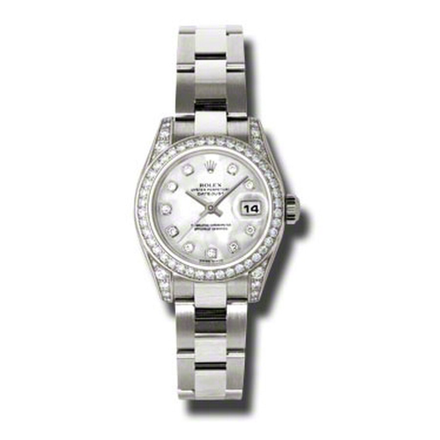 18k white gold (diamond-set lug) case with a 18k white gold rolex oyster bracelet. Fixed - 18k white gold diamond-set bezel. Mother of pearl dial with silver-tone hands and diamond hour markers. Dial Type: Analog. Date display at the 3 o'clock position. Automatic movement. Scratch resistant sapphire crystal. Screw down crown. Case diameter: 26 mm. Round case shape. Oysterlock clasp. Water resistant at 100 meters / 330 feet. Functions: date, hour, minute, second. Additional Info: 24 diamonds set on the lugs. Luxury watch style. Watch label: Swiss Made. Rolex Lady Datejust 26 Mother of Pearl Dial 18K White Gold Rolex Oyster Automatic Watch 179159MDO. GENERAL Color: Gold / Mother of pearl / Silver / White INFORMATION Brand: Rolex Series: Lady Datejust Collection Name: Lady Datejust Gender: Womens Model: 179159MDO Watch Label: Swiss Made Movement: Automatic Engine: Rolex Calibre 2235 Power Reserve: 48 hours CASE Case Size: 26 mm Case Material: 18kt White Gold (Diamond-Set Lug) Case Shape: Round Case Back: Solid BAND Band Material: 18kt White Gold Rolex Oyster Band Type: Bracelet Band Color: White Gold-tone Clasp: Oysterlock DIAL Dial Color: Mother of Pearl Type: Analog Crystal: Scratch Resistant Sapphire Hands: Silver-tone Dial Markers: Diamond Bezel: Fixed Bezel Color: 18kt White Gold Bezel Material: Diamond Set Crown: Screw Down FEATURES Water Resistance: 100 meters / 330 feet Calendar: Date display at the 3 o'clock position Functions: Date, Hour, Minute, Second, Chronometer Watch Features: Diamond, Gold, Chronometer, Analog ADDITIONAL INFO Watch Style: Luxury Warranty: 2 Year Jomashop Warranty UPC Code: 845960079921 Additional Info: 24 Diamonds Set on the Lugs Jomashop Sku: RLX179159MDO Department: Watches Category: Watches