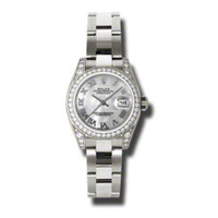 18k white gold (diamond-set lug) case with a 18k white gold rolex oyster bracelet. Fixed - 18k white gold diamond-set bezel. Mother of pearl dial with silver-tone hands and Roman numeral hour markers. Dial Type: Analog. Date display at the 3 o'clock position. Automatic movement. Scratch resistant sapphire crystal. Screw down crown. Case diameter: 26 mm. Round case shape. Oysterlock clasp. Water resistant at 100 meters / 330 feet. Functions: date, hour, minute, second. Additional Info: 24 diamonds set on the lugs. Luxury watch style. Watch label: Swiss Made. Rolex Lady Datejust 26 Mother of Pearl Dial 18K White Gold Rolex Oyster Automatic Watch 179159MRO. GENERAL Color: Gold / Mother of pearl / Silver / White INFORMATION Brand: Rolex Series: Lady Datejust Collection Name: Lady Datejust Gender: Womens Model: 179159MRO Watch Label: Swiss Made Movement: Automatic Engine: Rolex Calibre 2235 Power Reserve: 48 hours CASE Case Size: 26 mm Case Material: 18kt White Gold (Diamond-Set Lug) Case Shape: Round Case Back: Solid BAND Band Material: 18kt White Gold Rolex Oyster Band Type: Bracelet Band Color: White Gold-tone Clasp: Oysterlock DIAL Dial Color: Mother of Pearl Type: Analog Crystal: Scratch Resistant Sapphire Hands: Silver-tone Dial Markers: Roman Numeral Bezel: Fixed Bezel Color: 18kt White Gold Bezel Material: Diamond Set Crown: Screw Down FEATURES Water Resistance: 100 meters / 330 feet Calendar: Date display at the 3 o'clock position Functions: Date, Hour, Minute, Second, Chronometer Watch Features: Diamond, Gold, Chronometer, Analog ADDITIONAL INFO Watch Style: Luxury Warranty: 2 Year Jomashop Warranty UPC Code: 845960079945 Additional Info: 24 Diamonds Set on the Lugs Jomashop Sku: RLX179159MRO Department: Watches Category: Watches