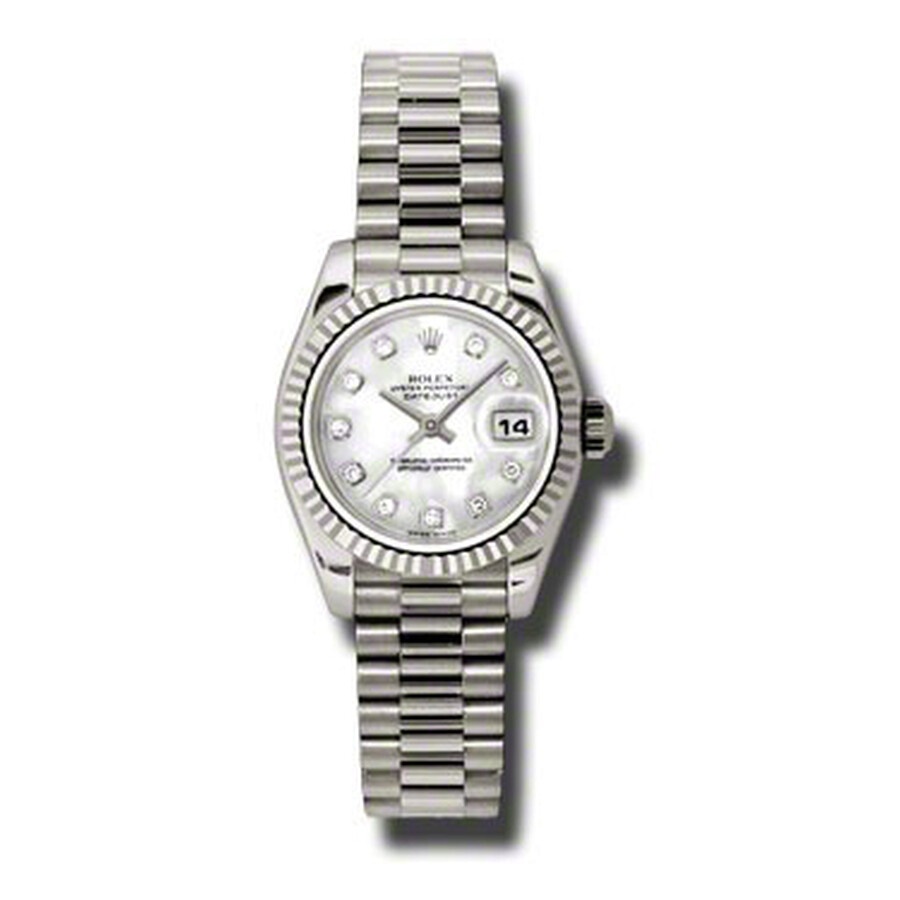 18k white gold case with a 18k white gold Rolex President bracelet. Fixed - fluted 18k white gold bezel. Mother of pearl dial with silver-tone hands and diamond hour markers. Dial Type: Analog. Date display at the 3 o'clock position. Automatic movement. Scratch resistant sapphire crystal. Screw down crown. Solid case back. Case diameter: 26 mm. Round case shape. Concealed Crown clasp. Water resistant at 100 meters / 330 feet. Functions: date, hour, minute, second. Luxury watch style. Watch label: Swiss Made. Rolex Lady-Datejust 26 Mother Of Pearl Dial 18K White Gold President Automatic Ladies Diamond Watch 179179MDP. GENERAL Color: Gold / Mother of pearl / White INFORMATION Brand: Rolex Series: Lady Datejust Collection Name: Lady Datejust Gender: Womens Model: 179179MDP Watch Label: Swiss Made Movement: Automatic Engine: Rolex Calibre 2235 Power Reserve: 48 hours CASE Case Size: 26 mm Case Material: 18kt White Gold Case Shape: Round Case Back: Solid BAND Band Material: 18kt White Gold Rolex President Band Type: Bracelet Band Color: White Gold-tone Clasp: Concealed Crown DIAL Dial Color: Mother Of Pearl Type: Analog Crystal: Scratch Resistant Sapphire Hands: Silver-Tone Dial Markers: Diamond Bezel: Fixed Fluted Bezel Material: 18kt White Gold Crown: Screw Down FEATURES Water Resistance: 100 meters / 330 feet Calendar: Date display at the 3 o'clock position Functions: Date, Hour, Minute, Second, Chronometer Watch Features: Diamond, Gold, Chronometer, Analog ADDITIONAL INFO Watch Style: Luxury Warranty: 2 Year Jomashop Warranty UPC Code: 845960081146 Jomashop Sku: RLX179179MDP Department: Watches Category: Watches