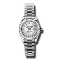 Platinum case with a platinum rolex president bracelet. Fixed - platinum diamond-set bezel. Mother of pearl dial with silver tone hands and diamond hour markers. Diamonds. Dial Type: Analog. Date display at the 3 o'clock position. Automatic movement, Rolex calibre 2235 engine with about 48 hours power reserve. Scratch resistant sapphire crystal. Screw down crown. Solid case back. Case diameter: 26 mm. Round case shape. Concealed crown clasp. Water resistant at 100 meters / 330 feet. Functions: date, hour, minute, second. Luxury watch style. Watch label: Swiss Made. Rolex Lady-Datejust 26 Mother Of Pearl Dial Platinum President Automatic Ladies Watch 179136MDP. GENERAL Color: Mother of pearl / Platinum INFORMATION Brand: Rolex Series: Lady Datejust Collection Name: Lady Datejust Gender: Womens Model: 179136MDP Watch Label: Swiss Made Movement: Automatic Engine: Rolex Calibre 2235 Power Reserve: 48 hours CASE Case Size: 26 mm Case Color: Grey Case Material: Platinum Case Shape: Round Case Back: Solid BAND Band Material: Platinum Rolex President Band Type: Bracelet Band Color: Grey Clasp: Concealed Crown DIAL Dial Color: Mother Of Pearl Type: Analog Crystal: Scratch Resistant Sapphire Hands: Silver tone Dial Markers: Diamond Second Markers: Diamonds Bezel: Fixed Bezel Color: Platinum Bezel Material: Diamond Set Crown: Screw Down FEATURES Water Resistance: 100 meters / 330 feet Calendar: Date display at the 3 o'clock position Functions: Date, Hour, Minute, Second, Chronometer Watch Features: Diamond, Chronometer, Platinum, Analog ADDITIONAL INFO Watch Style: Luxury Warranty: 2 Year Jomashop Warranty UPC Code: 845960040525 Jomashop Sku: RLX179136MDP Department: Watches Category: Watches