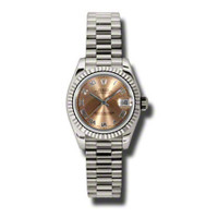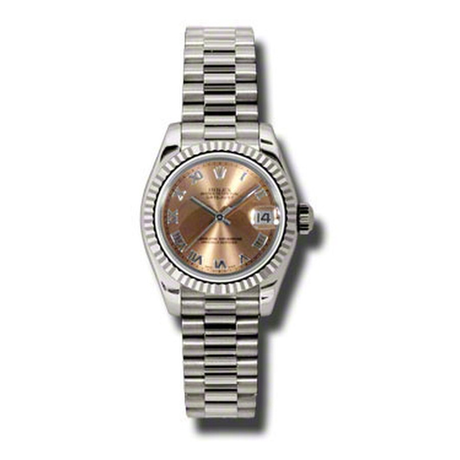 18k white gold case with a 18k white gold Rolex President bracelet. Fixed - fluted 18k white gold bezel. Pink dial with silver-tone hands and Roman numeral hour markers. Dial Type: Analog. Date display at the 3 o'clock position. Automatic movement. Scratch resistant sapphire crystal. Screw down crown. Solid case back. Case diameter: 26 mm. Round case shape. Concealed Crown clasp. Water resistant at 100 meters / 330 feet. Functions: date, hour, minute, second. Luxury watch style. Watch label: Swiss Made. Rolex Lady-Datejust 26 Pink Dial 18K White Gold President Automatic Ladies Watch 179179PRP. GENERAL Color: Gold / Pink / White INFORMATION Brand: Rolex Series: Lady Datejust Collection Name: Lady Datejust Gender: Womens Model: 179179PRP Watch Label: Swiss Made Movement: Automatic Engine: Rolex Calibre 2235 Power Reserve: 48 hours CASE Case Size: 26 mm Case Material: 18kt White Gold Case Shape: Round Case Back: Solid BAND Band Material: 18kt White Gold Rolex President Band Type: Bracelet Band Color: White Gold-tone Clasp: Concealed Crown DIAL Dial Color: Pink Type: Analog Crystal: Scratch Resistant Sapphire Hands: Silver-Tone Dial Markers: Roman Numeral Bezel: Fixed Fluted Bezel Material: 18kt White Gold Crown: Screw Down FEATURES Water Resistance: 100 meters / 330 feet Calendar: Date display at the 3 o'clock position Functions: Date, Hour, Minute, Second, Chronometer Watch Features: Gold, Chronometer, Analog ADDITIONAL INFO Watch Style: Luxury Warranty: 2 Year Jomashop Warranty UPC Code: 845960081177 Jomashop Sku: RLX179179PRP Department: Watches Category: Watches