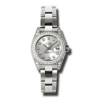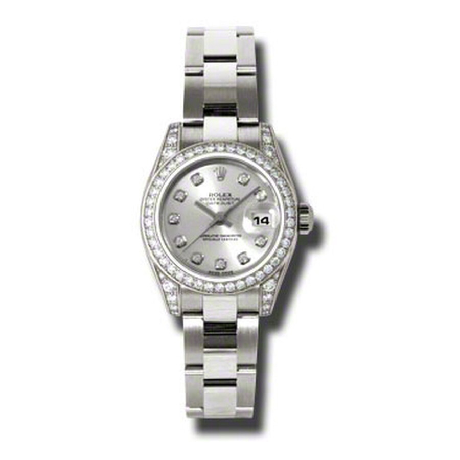 18k white gold (diamond-set lug) case with a 18k white gold rolex oyster bracelet. Fixed - 18k white gold diamond-set bezel. Silver dial with silver-tone hands and diamond hour markers. Dial Type: Analog. Date display at the 3 o'clock position. Automatic movement. Scratch resistant sapphire crystal. Screw down crown. Case diameter: 26 mm. Round case shape. Oyster lock clasp. Water resistant at 100 meters / 330 feet. Functions: date, hour, minute, second. Additional Info: 24 diamonds set on the lugs. Luxury watch style. Watch label: Swiss Made. Rolex Lady Datejust 26 Silver Dial 18K White Gold Rolex Oyster Automatic Watch 179159SDO. GENERAL Color: Gold / Silver / White INFORMATION Brand: Rolex Series: Lady Datejust Collection Name: Lady Datejust Gender: Womens Model: 179159SDO Watch Label: Swiss Made Movement: Automatic Engine: Rolex Calibre 2235 Power Reserve: 48 hours CASE Case Size: 26 mm Case Material: 18kt White Gold (Diamond-Set Lug) Case Shape: Round Case Back: Solid BAND Band Material: 18kt White Gold Rolex Oyster Band Type: Bracelet Band Color: White Gold-tone Clasp: Oysterlock DIAL Dial Color: Silver Type: Analog Crystal: Scratch Resistant Sapphire Hands: Silver-tone Dial Markers: Diamond Bezel: Fixed Bezel Color: 18kt White Gold Bezel Material: Diamond Set Crown: Screw Down FEATURES Water Resistance: 100 meters / 330 feet Calendar: Date display at the 3 o'clock position Functions: Date, Hour, Minute, Second, Chronometer Watch Features: Diamond, Gold, Chronometer, Analog ADDITIONAL INFO Watch Style: Luxury Warranty: 2 Year Jomashop Warranty UPC Code: 845960079969 Additional Info: 24 Diamonds Set on the Lugs Jomashop Sku: RLX179159SDO Department: Watches Category: Watches