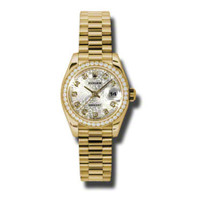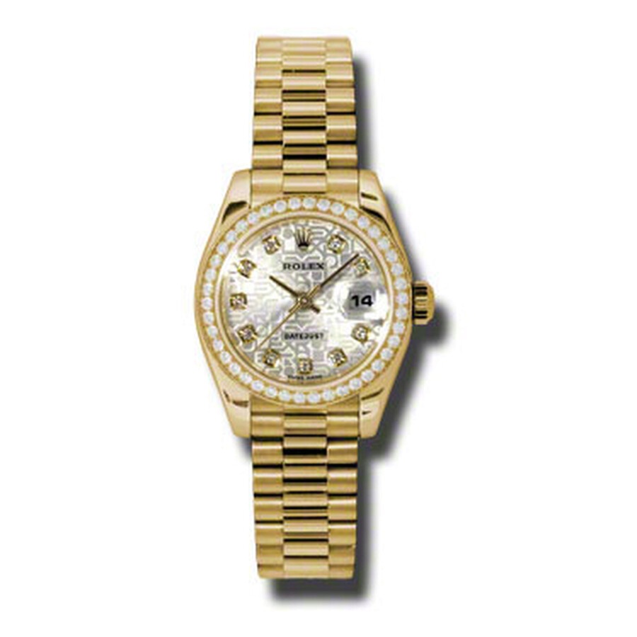 18k yellow gold case with a 18k yellow gold Rolex President bracelet. Fixed - 18k yellow gold diamond-set bezel. Silver jubilee dial with yellow gold-tone hands and diamond hour markers. Dial Type: Analog. Date display at the 3 o'clock position. Automatic movement. Scratch resistant sapphire crystal. Screw down crown. Solid case back. Case diameter: 26 mm. Round case shape. Concealed Crown clasp. Water resistant at 100 meters / 330 feet. Functions: date, hour, minute, second. Luxury watch style. Watch label: Swiss Made. Rolex Lady-Datejust 26 Silver Jubilee Dial 18K Yellow Gold President Automatic Ladies Diamond Watch 179138SJDP. GENERAL Color: Gold / Silver / Yellow INFORMATION Brand: Rolex Series: Lady Datejust Collection Name: Lady Datejust Gender: Womens Model: 179138SJDP Watch Label: Swiss Made Movement: Automatic Engine: Rolex Calibre 2235 Power Reserve: 48 hours CASE Case Size: 26 mm Case Material: 18kt Yellow Gold Case Shape: Round Case Back: Solid BAND Band Material: 18kt Yellow Gold Rolex President Band Type: Bracelet Band Color: Yellow Gold-tone Clasp: Concealed Crown DIAL Dial Color: Silver Jubilee Type: Analog Crystal: Scratch Resistant Sapphire Hands: Yellow Gold-Tone Dial Markers: Diamond Bezel: Fixed Bezel Color: 18kt Yellow Gold Bezel Material: Diamond Set Crown: Screw Down FEATURES Water Resistance: 100 meters / 330 feet Calendar: Date display at the 3 o'clock position Functions: Date, Hour, Minute, Second, Chronometer Watch Features: Diamond, Gold, Chronometer, Analog ADDITIONAL INFO Watch Style: Luxury Warranty: 2 Year Jomashop Warranty UPC Code: 845960079716 Jomashop Sku: RLX179138SJDP Department: Watches Category: Watches
