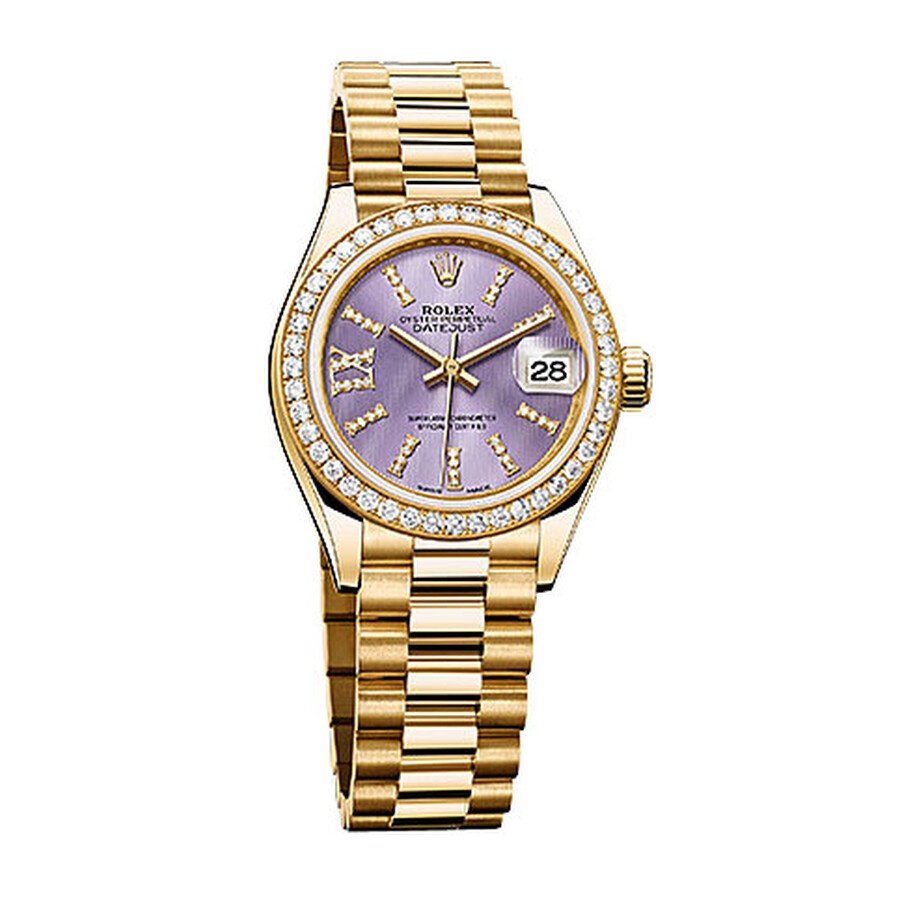 18k yellow gold case with a 18k yellow gold Rolex President bracelet. Fixed - 18k yellow gold diamond-set bezel. Lilac dial with yellow gold-tone hands and diamond hour markers. Diamond-filled roman numeral 9. Dial Type: Analog. Date display at the 3 o'clock position. Automatic movement. Scratch resistant sapphire crystal. Screw down crown. Case diameter: 28 mm. Round case shape. Concealed Crown clasp. Water resistant at 100 meters / 330 feet. Functions: date, hour, minute, second. Luxury watch style. Watch label: Swiss Made. Rolex Lady-Datejust 28 Lilac Dial 18K Yellow Gold President Automatic Ladies Diamond Watch 279138LIRDP. INFORMATION Brand: Rolex Series: Lady Datejust Collection Name: Lady Datejust Gender: Womens Model: 279138LIRDP Watch Label: Swiss Made Movement: Automatic Engine: Rolex Calibre 2236 Power Reserve: 55 hours CASE Case Size: 28 mm Case Material: 18kt Yellow Gold Case Shape: Round BAND Band Material: 18kt Yellow Gold Rolex President Band Type: Bracelet Band Color: Yellow Gold-tone Clasp: Concealed Crown DIAL Dial Color: Lilac Type: Analog Crystal: Scratch Resistant Sapphire Hands: Yellow Gold-Tone Dial Markers: Diamond Second Markers: Diamond-filled Roman Numeral 9 Bezel: Fixed Bezel Color: 18kt Yellow Gold Bezel Material: Diamond Set Crown: Screw Down FEATURES Water Resistance: 100 meters / 330 feet Calendar: Date display at the 3 o'clock position Functions: Date, Hour, Minute, Second, Chronometer Watch Features: Diamond, Gold, Chronometer, Analog ADDITIONAL INFO Watch Style: Luxury Warranty: 2 Year Jomashop Warranty UPC Code: 845960081856 Jomashop Sku: RLX279138LIRDP Department: Watches Category: Watches