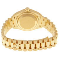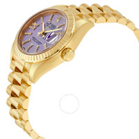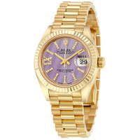 18k yellow gold case with a 18k yellow gold Rolex President bracelet. Fixed fluted 18k yellow gold bezel. Lilac dial with yellow gold-tone hands and diamond-filled index hour markers. Diamond-filled roman numeral 9. Dial Type: Analog. Date display at the 3 o'clock position. Automatic movement. Scratch resistant sapphire crystal. Screw down crown. Solid case back. Case diameter: 28 mm. Round case shape. Concealed Crown clasp. Water resistant at 100 meters / 330 feet. Functions: date, hour, minute, second. Luxury watch style. Watch label: Swiss Made. Rolex Lady-Datejust 28 Lilac Dial 18K Yellow Gold President Automatic Ladies Diamond Watch 279178LIRSDP. INFORMATION Brand: Rolex Series: Lady Datejust Collection Name: Lady Datejust Gender: Womens Model: 279178LIRSDP Watch Label: Swiss Made Movement: Automatic Engine: Rolex Calibre 2236 Power Reserve: 55 hours CASE Case Size: 28 mm Case Material: 18kt Yellow Gold Case Shape: Round Case Back: Solid BAND Band Material: 18kt Yellow Gold Rolex President Band Type: Bracelet Band Color: Yellow Gold-tone Clasp: Concealed Crown DIAL Dial Color: Lilac Type: Analog Crystal: Scratch Resistant Sapphire Hands: Yellow Gold-Tone Dial Markers: Diamond-filled Index Second Markers: Diamond-filled Roman Numeral 9 Bezel: Fixed Fluted Bezel Material: 18kt Yellow Gold Crown: Screw Down FEATURES Water Resistance: 100 meters / 330 feet Calendar: Date display at the 3 o'clock position Functions: Date, Hour, Minute, Second, Chronometer Watch Features: Diamond, Gold, Chronometer, Analog ADDITIONAL INFO Watch Style: Luxury Warranty: 2 Year Jomashop Warranty UPC Code: 845960066839 Jomashop Sku: RLX279178LIRSDP Department: Watches Category: Watches
