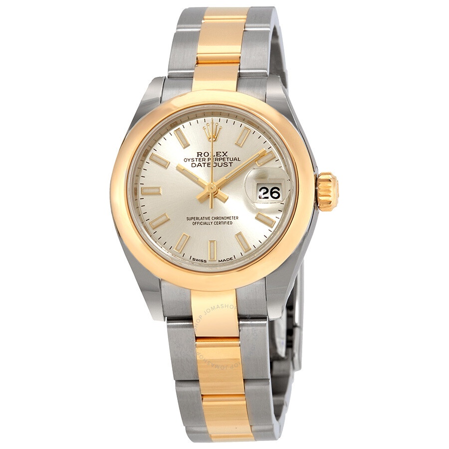 Stainless steel case with a stainless steel Roklex oyster bracelet with 18kt yellow gold center links. Fixed 18kt yellow gold bezel. Silver dial with luminous gold-tone hands and index hour markers. Dial Type: Analog. Luminescent hands and markers. Date display at the 3 o'clock position. Rolex calibre 2236 automatic movement, based upon Rolex 2235, containing 31 Jewels, bitting at 28800 vph, and has a power reserve of approximately 55 hours. Scratch resistant sapphire crystal. Screw down crown. Solid case back. Round case shape. Case size: 28 mm. Oyster clasp. Water resistant at 100 meters / 330 feet. Functions: date, hour, minute, second. Lady Datejust 28 Series. Luxury watch style. Watch label: Swiss Made. Rolex Lady Datejust 28 Silver Dial Steel and 18K Yellow Gold Oyster Watch 279163SSO. INFORMATION Brand: Rolex Series: Lady Datejust Collection Name: Lady Datejust Gender: Womens Model: 279163SSO Watch Label: Swiss Made Movement: Automatic Engine: Rolex Calibre 2236 Power Reserve: 55 hours CASE Case Size: 28 mm Case Material: Stainless Steel Case Shape: Round Case Back: Solid BAND Band Material: Stainless Steel with 18kt Yellow Gold Rolex Oyster Band Type: Bracelet Band Color: Silver-tone Clasp: Oyster DIAL Dial Color: Silver Type: Analog Crystal: Scratch Resistant Sapphire Hands: Luminous Gold-tone Dial Markers: Index Luminiscence: Hands and Markers Bezel: Fixed Bezel Material: 18kt Yellow Gold Crown: Screw Down FEATURES Water Resistance: 100 meters / 330 feet Calendar: Date display at the 3 o'clock position Functions: Date, Hour, Minute, Second Watch Features: Stainless Steel, Gold, Analog ADDITIONAL INFO Watch Style: Luxury Warranty: 2 Year Jomashop Warranty Jomashop Sku: RLX279163SSO Department: Watches Category: Watches