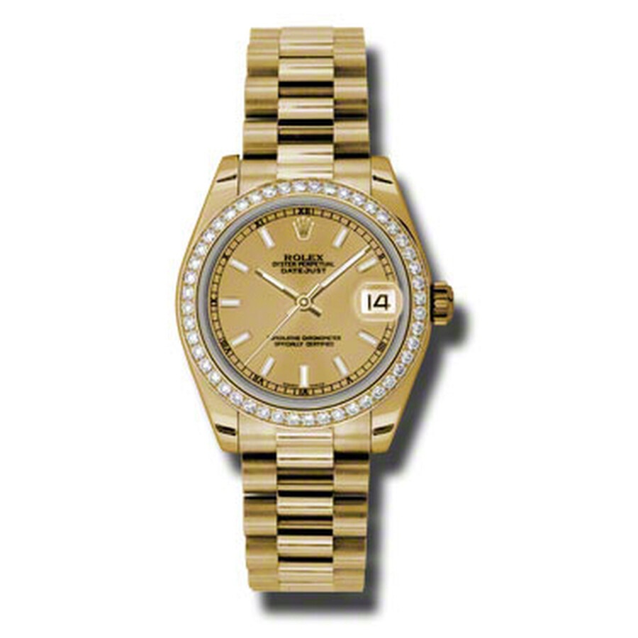 18k yellow gold case with a 18k yellow gold Rolex President bracelet. Fixed - 18k yellow gold diamond-set bezel. Champagne dial with yellow gold-tone hands and index hour markers. Minute markers around the outer rim. Dial Type: Analog. Date display at the 3 o'clock position. Automatic movement. Scratch resistant sapphire crystal. Screw down crown. Solid case back. Case diameter: 31 mm. Round case shape. Concealed Crown clasp. Water resistant at 100 meters / 330 feet. Functions: date, hour, minute, second. Luxury watch style. Watch label: Swiss Made. Rolex Lady-Datejust 31 Champagne Dial 18K Yellow Gold President Automatic Ladies Diamond Watch 178288CSP. GENERAL Color: Champagne / Gold / Yellow INFORMATION Brand: Rolex Series: Datejust Lady 31 Collection Name: Datejust Lady 31 Gender: Womens Model: 178288CSP Watch Label: Swiss Made Movement: Automatic Engine: Rolex Calibre 2235 Power Reserve: 48 hours CASE Case Size: 31 mm Case Material: 18kt Yellow Gold Case Shape: Round Case Back: Solid BAND Band Material: 18kt Yellow Gold Rolex President Band Type: Bracelet Band Color: Yellow Gold-tone Clasp: Concealed Crown DIAL Dial Color: Champagne Type: Analog Crystal: Scratch Resistant Sapphire Hands: Yellow Gold-Tone Dial Markers: Index Second Markers: Minute Markers around the outer rim Luminiscence: Hands and Markers Bezel: Fixed Bezel Color: 18kt Yellow Gold Bezel Material: Diamond Set Crown: Screw Down FEATURES Water Resistance: 100 meters / 330 feet Calendar: Date display at the 3 o'clock position Functions: Date, Hour, Minute, Second, Chronometer Watch Features: Diamond, Gold, Chronometer, Analog ADDITIONAL INFO Watch Style: Luxury Warranty: 2 Year Jomashop Warranty UPC Code: 845960078252 Jomashop Sku: RLX178288CSP Department: Watches Category: Watches