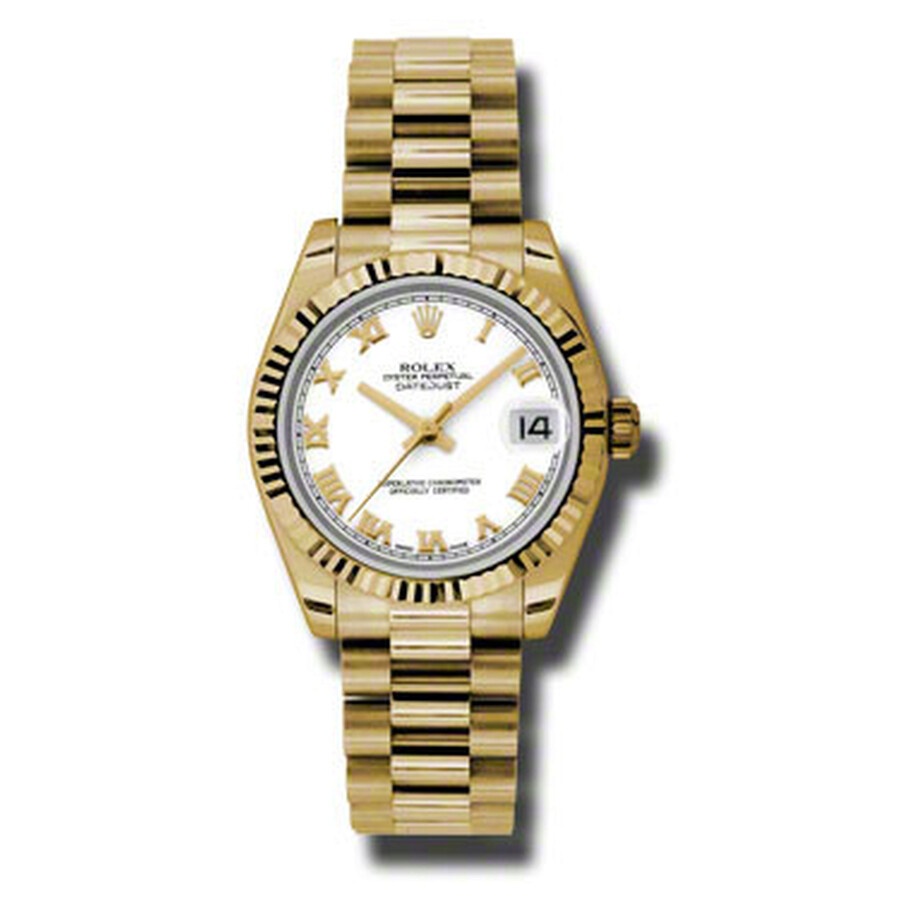 18k yellow gold case with a 18k yellow gold Rolex President bracelet. Fixed - fluted 18k yellow gold bezel. White dial with yellow gold-tone hands and Roman numeral hour markers. Minute markers around the outer rim. Dial Type: Analog. Date display at the 3 o'clock position. Automatic movement. Scratch resistant sapphire crystal. Screw down crown. Solid case back. Case diameter: 31 mm. Round case shape. Concealed Crown clasp. Water resistant at 100 meters / 330 feet. Functions: date, hour, minute, second. Luxury watch style. Watch label: Swiss Made. Rolex Lady-Datejust 31 White Dial 18K Yellow Gold President Automatic Ladies Watch 178278WRP. GENERAL Color: Gold / White / Yellow INFORMATION Brand: Rolex Series: Datejust Lady 31 Collection Name: Datejust Lady 31 Gender: Womens Model: 178278WRP Watch Label: Swiss Made Movement: Automatic Engine: Rolex Calibre 2235 Power Reserve: 48 hours CASE Case Size: 31 mm Case Material: 18kt Yellow Gold Case Shape: Round Case Back: Solid BAND Band Material: 18kt Yellow Gold Rolex President Band Type: Bracelet Band Color: Yellow Gold-tone Clasp: Concealed Crown DIAL Dial Color: White Type: Analog Crystal: Scratch Resistant Sapphire Hands: Yellow Gold-Tone Dial Markers: Roman Numeral Second Markers: Minute Markers around the outer rim Bezel: Fixed Fluted Bezel Material: 18kt Yellow Gold Crown: Screw Down FEATURES Water Resistance: 100 meters / 330 feet Calendar: Date display at the 3 o'clock position Functions: Date, Hour, Minute, Second, Chronometer Watch Features: Gold, Chronometer, Analog ADDITIONAL INFO Watch Style: Luxury Warranty: 2 Year Jomashop Warranty UPC Code: 845960078207 Jomashop Sku: RLX178278WRP Department: Watches Category: Watches