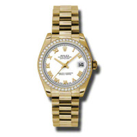 18k yellow gold case with a 18k yellow gold Rolex President bracelet. Fixed - 18k yellow gold diamond-set bezel. White dial with yellow gold-tone hands and Roman numeral hour markers. Minute markers around the outer rim. Dial Type: Analog. Date display at the 3 o'clock position. Automatic movement. Scratch resistant sapphire crystal. Screw down crown. Solid case back. Case diameter: 31 mm. Round case shape. Concealed Crown clasp. Water resistant at 100 meters / 330 feet. Functions: date, hour, minute, second. Luxury watch style. Watch label: Swiss Made. Rolex Lady-Datejust 31 White Dial 18K Yellow Gold President Automatic Ladies Diamond Watch 178288WRP. GENERAL Color: Gold / White / Yellow INFORMATION Brand: Rolex Series: Datejust Lady 31 Collection Name: Datejust Lady 31 Gender: Womens Model: 178288WRP Watch Label: Swiss Made Movement: Automatic Engine: Rolex Calibre 2235 Power Reserve: 48 hours CASE Case Size: 31 mm Case Material: 18kt Yellow Gold Case Shape: Round Case Back: Solid BAND Band Material: 18kt Yellow Gold Rolex President Band Type: Bracelet Band Color: Yellow Gold-tone Clasp: Concealed Crown DIAL Dial Color: White Type: Analog Crystal: Scratch Resistant Sapphire Hands: Yellow Gold-Tone Dial Markers: Roman Numeral Second Markers: Minute Markers around the outer rim Bezel: Fixed Bezel Color: 18kt Yellow Gold Bezel Material: Diamond Set Crown: Screw Down FEATURES Water Resistance: 100 meters / 330 feet Calendar: Date display at the 3 o'clock position Functions: Date, Hour, Minute, Second, Chronometer Watch Features: Diamond, Gold, Chronometer, Analog ADDITIONAL INFO Watch Style: Luxury Warranty: 2 Year Jomashop Warranty UPC Code: 845960078306 Jomashop Sku: RLX178288WRP Department: Watches Category: Watches