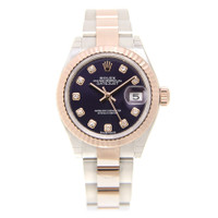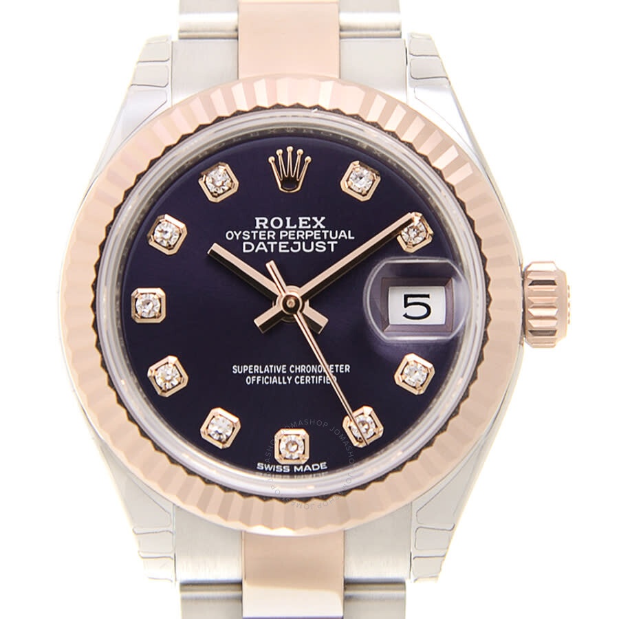 Stainless steel case with a stainless steel and 18kt everose gold rolex oyster bracelet. Fixed fluted 18kt everose gold bezel. Aubergine dial with everose gold hands and diamond hour markers. Dial Type: Analog. Date display at the 3 o'clock position. Rolex Calibre 2236 Automatic movement, based upon Rolex 2235, containing 31 Jewels, bitting at 28800 vph, and has a power reserve of approximately 55 hours. Scratch resistant sapphire crystal. Screw down crown. Solid case back. Round case shape, case size: 28 mm, case thickness: 11 mm. Crown clasp. Water resistant at 100 meters / 330 feet. Functions: date, hour, minute, second. Lady Datejust 28 Series. Luxury watch style. Watch label: Swiss Made. Rolex Lady-Datejust Aubergine Diamond Dial Automatic Ladies Oyster Watch 279171OBDJ. INFORMATION Brand: Rolex Series: Lady Datejust Collection Name: Lady Datejust Gender: Womens Model: 279171OBDO Watch Label: Swiss Made Movement: Automatic Engine: Rolex Calibre 2236 Power Reserve: 55 hours CASE Case Size: 28 mm Case Thickness: 11 mm Case Material: Stainless Steel Case Shape: Round Case Back: Solid BAND Band Material: Stainless Steel and 18kt Rose Gold Rolex Oyster Band Type: Bracelet Band Color: Two-tone (Silver-tone and Rose Gold-tone) Clasp: Crown DIAL Dial Color: Aubergine Type: Analog Crystal: Scratch Resistant Sapphire Hands: Rose Gold-tone Dial Markers: Diamond Bezel: Fixed Fluted Bezel Color: Rose Gold-tone Bezel Material: 18kt Rose Gold Crown: Screw Down FEATURES Water Resistance: 100 meters / 330 feet Calendar: Date display at the 3 o'clock position Functions: Date, Hour, Minute, Second Watch Features: Diamond, Stainless Steel, Gold, Analog ADDITIONAL INFO Watch Style: Luxury Warranty: 2 Year Jomashop Warranty Jomashop Sku: RLX279171OBDO Department: Watches Category: Watches