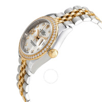 Stainless steel case with a stainless steel Rolex jubilee bracelet with 18kt yellow gold center links. Fixed 18kt yellow gold bezel set with diamonds. Silver dial with gold-tone hands and diamond hour markers. A diamond-set Roman numeral appears at the 9 o'clock position. Dial Type: Analog. Date display at the 3 o'clock position. Rolex caliber 2236 automatic movement with a 55-hour power reserve. Scratch resistant sapphire crystal. Screw down crown. Solid case back. Round case shape. Case size: 28 mm. Fold over clasp. Water resistant at 100 meters / 330 feet. Functions: date, hour, minute, second, chronometer. Lady Datejust Series. Luxury watch style. Watch label: Swiss Made. Rolex Lady Datejust Automatic Chronometer Diamond Silver Dial Ladies Watch 279383. INFORMATION Brand: Rolex Series: Lady Datejust Collection Name: Lady Datejust Gender: Womens Model: 279383 Watch Label: Swiss Made Movement: Automatic Engine: Rolex Caliber 2236 Power Reserve: 55 hours CASE Case Size: 28 mm Case Material: Stainless Steel Case Shape: Round Case Back: Solid BAND Band Material: Stainless Steel and 18kt Yellow Gold Rolex Jubilee Band Type: Bracelet Band Color: Silver-tone Clasp: Fold Over DIAL Dial Color: Silver Type: Analog Crystal: Scratch Resistant Sapphire Hands: Gold-tone Dial Markers: Diamond Second Markers: Diamond-set Roman Numeral appears at the 9 o'clock position. Bezel: Fixed Bezel Material: 18kt Yellow Gold Set With Diamonds Crown: Screw Down FEATURES Water Resistance: 100 meters / 330 feet Calendar: Date display at the 3 o'clock position Functions: Date, Hour, Minute, Second, Chronometer Watch Features: Diamond, Stainless Steel, Gold, Chronometer, Analog ADDITIONAL INFO Watch Style: Luxury Warranty: 2 Year Jomashop Warranty Jomashop Sku: RLX279383SDJO Department: Watches Category: Watches
