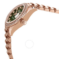 18kt everose gold case with a 18kt everose gold Rolex president bracelet. Fixed 18kt everose gold bezel set with diamonds. Green dial with everose gold hands and diamond hour markers. Dial Type: Analog. Date display at the 3 o'clock position. Rolex calibre 2236 automatic movement, based upon Rolex 2235, containing 31 Jewels, bitting at 28800 vph, and has a power reserve of approximately 55 hours. Scratch resistant sapphire crystal. Screw down crown. Screw down case back. Round case shape. Case size: 28 mm. Fold over clasp. Water resistant at 100 meters / 330 feet. Functions: date, hour, minute, second. Lady-datejust Series. Dress watch style. Watch label: Swiss Made. Rolex Lady-Datejust Automatic Diamond Green Dial Ladies Watch 279135GNDP. CASE Case Size: 28 Case Material: 18kt Everose Gold Case Shape: Round Case Back: Screw Down BAND Band Material: 18kt Everose Gold Rolex President Band Type: Bracelet Clasp: Fold Over DIAL Dial Color: Green Type: Analog Crystal: Scratch Resistant Sapphire Hands: Everose Gold Dial Markers: Diamond Bezel: Fixed Bezel Material: 18kt Everose Gold set with Diamonds Crown: Screw Down INFORMATION Brand: Rolex Series: Lady Datejust Collection Name: Lady Datejust Gender: Womens Model: M279135RBR-0014 Watch Label: Swiss Made Movement: Automatic Engine: Rolex Calibre 2236 Power Reserve: 55 hours FEATURES Water Resistance: 100 meters / 330 feet Calendar: Date display at the 3 o'clock position Functions: Date, Hour, Minute, Second Watch Features: Diamond, Gold, Analog ADDITIONAL INFO Watch Style: Dress Warranty: 2 Year Jomashop Warranty Jomashop Sku: RLX279135GNDP Item Variation: 279135GNDP, 279135RBR-0014 Department: Watches Category: Watches