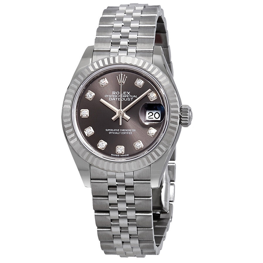 Silver-tone stainless steel case with a silver-tone stainless steel rolex jubilee bracelet. Fixed - fluted silver-tone stainless steel bezel. Grey dial with silver-tone hands and diamond hour markers. Dial Type: Analog. Date display at the 3 o'clock position. Rolex Calibre 2236 automatic movement with a 55-hour power reserve. Scratch resistant sapphire crystal. Screw down crown. Solid case back. Round case shape. Case size: 28 mm. Fold over with safety release clasp. Water resistant at 100 meters / 330 feet. Functions: date, hour, minute, second. Luxury watch style. Watch label: Swiss Made. Rolex Lady Datejust Automatic Grey Diamond Dial Ladies Jubilee Watch 279174GYDJ. INFORMATION Brand: Rolex Series: Lady Datejust Collection Name: Lady Datejust Gender: Womens Model: 279174GYDJ Watch Label: Swiss Made Movement: Automatic Engine: Rolex Calibre 2236 Power Reserve: 55 hours CASE Case Size: 28 mm Case Color: Silver-Tone Case Material: Stainless Steel Case Shape: Round Case Back: Solid BAND Band Material: Stainless Steel Rolex Jubilee Band Type: Bracelet Band Color: Silver-tone Clasp: Folding DIAL Dial Color: Grey Type: Analog Crystal: Scratch Resistant Sapphire Hands: Silver-tone Dial Markers: Diamond Bezel: Fixed Fluted Bezel Color: Silver-tone Bezel Material: Stainless Steel Crown: Screw Down FEATURES Water Resistance: 100 meters / 330 feet Calendar: Date display at the 3 o'clock position Functions: Date, Hour, Minute, Second Watch Features: Diamond, Stainless Steel, Analog ADDITIONAL INFO Watch Style: Luxury Warranty: 2 Year Jomashop Warranty Jomashop Sku: RLX279174GYDJ Department: Watches Category: Watches
