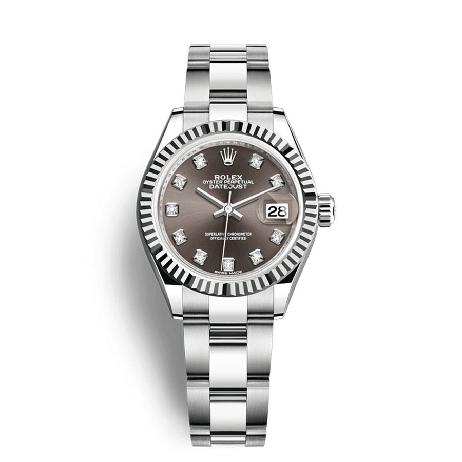 Silver-tone stainless steel case with a silver-tone stainless steel rolex oyster bracelet. Fixed - fluted silver-tone stainless steel bezel. Grey dial with silver-tone hands and diamond hour markers. Dial Type: Analog. Date display at the 3 o'clock position. Rolex Calibre 2236 automatic movement with a 55-hour power reserve. Scratch resistant sapphire crystal. Screw down crown. Solid case back. Round case shape. Case size: 28 mm. Fold over with safety release clasp. Water resistant at 100 meters / 330 feet. Functions: date, hour, minute, second. Luxury watch style. Watch label: Swiss Made. Rolex Lady Datejust Automatic Grey Diamond Dial Ladies Oyster Watch 279174GYDO. INFORMATION Brand: Rolex Series: Datejust Collection Name: Lady Datejust Gender: Womens Model: 279174GYDO Watch Label: Swiss Made Movement: Automatic Engine: Rolex Calibre 2236 Power Reserve: 55 hours CASE Case Size: 28 mm Case Color: Silver-Tone Case Material: Stainless Steel Case Shape: Round Case Back: Solid BAND Band Material: Stainless Steel Rolex Oyster Band Type: Bracelet Band Color: Silver-tone Clasp: Folding DIAL Dial Color: Grey Type: Analog Crystal: Scratch Resistant Sapphire Hands: Silver-tone Dial Markers: Diamond Bezel: Fixed Fluted Bezel Color: Silver-tone Bezel Material: Stainless Steel Crown: Screw Down FEATURES Water Resistance: 100 meters / 330 feet Calendar: Date display at the 3 o'clock position Functions: Date, Hour, Minute, Second Watch Features: Diamond, Stainless Steel, Analog ADDITIONAL INFO Watch Style: Luxury Warranty: 2 Year Jomashop Warranty Jomashop Sku: RLX279174GYDO Department: Watches Category: Watches