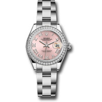 Silver-tone stainless steel case with a silver-tone stainless steel rolex oyster bracelet. Fixed silver-tone diamond set bezel. Pink dial with silver-tone hands and Roman numeral hour markers. Dial Type: Analog. Date display at the 3 o'clock position. Rolex Calibre 2236 automatic movement with a 55-hour power reserve. Scratch resistant sapphire crystal. Screw down crown. Solid case back. Round case shape. Case size: 28 mm. Fold over with safety release clasp. Water resistant at 100 meters / 330 feet. Functions: date, hour, minute, second. Luxury watch style. Watch label: Swiss Made. Rolex Lady Datejust Automatic Pink Dial Ladies Oyster Watch 279384PRO. INFORMATION Brand: Rolex Series: Lady Datejust Collection Name: Lady Datejust Gender: Womens Model: 279384PRO Watch Label: Swiss Made Movement: Automatic Engine: Rolex Calibre 2236 Power Reserve: 55 hours CASE Case Size: 28 mm Case Color: Silver-Tone Case Material: Stainless Steel Case Shape: Round Case Back: Solid BAND Band Material: Stainless Steel Rolex Oyster Band Type: Bracelet Band Color: Silver-tone Clasp: Folding DIAL Dial Color: Pink Type: Analog Crystal: Scratch Resistant Sapphire Hands: Silver-tone Dial Markers: Roman Numeral Bezel: Fixed Bezel Color: Silver-tone Bezel Material: Diamond Set Crown: Screw Down FEATURES Water Resistance: 100 meters / 330 feet Calendar: Date display at the 3 o'clock position Functions: Date, Hour, Minute, Second Watch Features: Diamond, Stainless Steel, Analog ADDITIONAL INFO Watch Style: Luxury Warranty: 2 Year Jomashop Warranty Jomashop Sku: RLX279384PRO Department: Watches Category: Watches