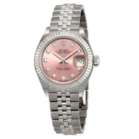 Silver-tone stainless steel case with a silver-tone stainless steel rolex jubilee bracelet. Fixed - fluted silver-tone stainless steel bezel. Pink dial with silver-tone hands and diamond hour markers. Dial Type: Analog. Date display at the 3 o'clock position. Rolex Calibre 2236 automatic movement with a 55-hour power reserve. Scratch resistant sapphire crystal. Screw down crown. Solid case back. Round case shape. Case size: 28 mm. Fold over with safety release clasp. Water resistant at 100 meters / 330 feet. Functions: date, hour, minute, second. Luxury watch style. Watch label: Swiss Made. Rolex Lady Datejust Automatic Pink Diamond Dial Ladies Jubilee Watch 279174PDJ. INFORMATION Brand: Rolex Series: Lady Datejust Collection Name: Lady Datejust Gender: Womens Model: 279174PDJ Watch Label: Swiss Made Movement: Automatic Engine: Rolex Calibre 2236 Power Reserve: 55 hours CASE Case Size: 28 mm Case Color: Silver-Tone Case Material: Stainless Steel Case Shape: Round Case Back: Solid BAND Band Material: Stainless Steel Rolex Jubilee Band Type: Bracelet Band Color: Silver-tone Clasp: Folding DIAL Dial Color: Pink Type: Analog Crystal: Scratch Resistant Sapphire Hands: Silver-tone Dial Markers: Diamond Bezel: Fixed Fluted Bezel Color: Silver-tone Bezel Material: Stainless Steel Crown: Screw Down FEATURES Water Resistance: 100 meters / 330 feet Calendar: Date display at the 3 o'clock position Functions: Date, Hour, Minute, Second Watch Features: Diamond, Stainless Steel, Analog ADDITIONAL INFO Watch Style: Luxury Warranty: 2 Year Jomashop Warranty UPC Code: 842047146903 Jomashop Sku: RLX279174PDJ Department: Watches Category: Watches