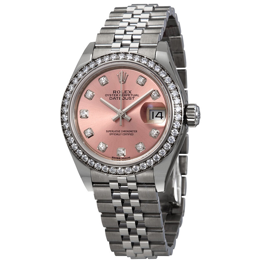Stainless steel case with a stainless steel Rolex jubilee bracelet. Fixed stainless steel bezel set with diamonds. Pink dial with silver-tone hands and diamond hour markers. Dial Type: Analog. Date display at the 3 o'clock position. Rolex calibre 2236 automatic movement, based upon Rolex 2235, containing 31 jewels, bitting at 28800 vph, and has a power reserve of approximately 55 hours. Scratch resistant sapphire crystal. Screw down crown. Solid case back. Round case shape. Case size: 28 mm. Fold over clasp. Water resistant at 100 meters / 330 feet. Functions: date, hour, minute, second. Lady Datejust Series. Luxury watch style. Watch label: Swiss Made. Item Variations: 279384rbr-0003, m279384rbr-0003. Rolex Lady Datejust Automatic Pink Diamond Dial Ladies Jubilee Watch 279384PDJ. INFORMATION Brand: Rolex Series: Lady Datejust Collection Name: Lady Datejust Gender: Womens Model: 279384PDJ Watch Label: Swiss Made Movement: Automatic Engine: Rolex Calibre 2236 Power Reserve: 55 hours CASE Case Size: 28 mm Case Color: Silver-Tone Case Material: Stainless Steel Case Shape: Round Case Back: Solid BAND Band Material: Stainless Steel Rolex Jubilee Band Type: Bracelet Band Color: Silver-tone Clasp: Fold Over DIAL Dial Color: Pink Type: Analog Crystal: Scratch Resistant Sapphire Hands: Silver-tone Dial Markers: Diamond Bezel: Fixed Bezel Color: Silver-tone Bezel Material: Stainless Steel set with Diamonds Crown: Screw Down FEATURES Water Resistance: 100 meters / 330 feet Calendar: Date display at the 3 o'clock position Functions: Date, Hour, Minute, Second Watch Features: Diamond, Stainless Steel, Analog ADDITIONAL INFO Watch Style: Luxury Warranty: 2 Year Jomashop Warranty UPC Code: 842047147085 Jomashop Sku: RLX279384PDJ Item Variation: 279384rbr-0003, m279384rbr-0003 Department: Watches Category: Watches