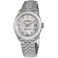Stainless steel case with a stainless steel Rolex jubilee bracelet. Fixed domed stainless steel bezel. Silver dial with silver-tone hands and Roman numeral hour markers. Dial Type: Analog. Date display at the 3 o'clock position. Rolex calibre 2236 automatic movement, based upon Rolex 2235, containing 31 Jewels, bitting at 28800 vph, and has a power reserve of approximately 55 hours. Scratch resistant sapphire crystal. Screw down crown. Solid case back. Round case shape. Case size: 28 mm. Fold over clasp. Water resistant at 100 meters / 330 feet. Functions: date, hour, minute, second. Lady Datejust Series. Luxury watch style. Watch label: Swiss Made. Rolex Lady Datejust Automatic Silver Dial Ladies Jubilee Watch 279160SRJ. INFORMATION Brand: Rolex Series: Lady Datejust Collection Name: Lady Datejust Gender: Womens Model: 279160SRJ Watch Label: Swiss Made Movement: Automatic Engine: Rolex Calibre 2236 Power Reserve: 55 hours CASE Case Size: 28 mm Case Color: Silver-Tone Case Material: Stainless Steel Case Shape: Round Case Back: Solid BAND Band Material: Stainless Steel Rolex Jubilee Band Type: Bracelet Band Color: Silver-tone Clasp: Fold Over DIAL Dial Color: Silver Type: Analog Crystal: Scratch Resistant Sapphire Hands: Silver-tone Dial Markers: Roman Numeral Bezel: Fixed Domed Bezel Color: Silver-tone Bezel Material: Stainless Steel Crown: Screw Down FEATURES Water Resistance: 100 meters / 330 feet Calendar: Date display at the 3 o'clock position Functions: Date, Hour, Minute, Second Watch Features: Stainless Steel, Analog ADDITIONAL INFO Watch Style: Luxury Warranty: 2 Year Jomashop Warranty Jomashop Sku: RLX279160SRJ Department: Watches Category: Watches