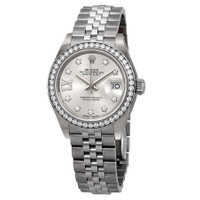 Silver-tone stainless steel case with a silver-tone stainless steel rolex jubilee bracelet. Fixed silver-tone diamond set bezel. Silver dial with silver-tone hands and Roman - diamond hour markers. Dial Type: Analog. Date display at the 3 o'clock position. Rolex Calibre 2236 automatic movement with a 55-hour power reserve. Scratch resistant sapphire crystal. Screw down crown. Solid case back. Round case shape. Case size: 28 mm. Fold over with safety release clasp. Water resistant at 100 meters / 330 feet. Functions: date, hour, minute, second. Luxury watch style. Watch label: Swiss Made. Rolex Lady Datejust Automatic Silver Roman Diamond Dial Ladies Jubilee Watch 279384SRDJ. INFORMATION Brand: Rolex Series: Lady Datejust Collection Name: Lady Datejust Gender: Womens Model: 279384SRDJ Watch Label: Swiss Made Movement: Automatic Engine: Rolex Calibre 2236 Power Reserve: 55 hours CASE Case Size: 28 mm Case Color: Silver-Tone Case Material: Stainless Steel Case Shape: Round Case Back: Solid BAND Band Material: Stainless Steel Rolex Jubilee Band Type: Bracelet Band Color: Silver-tone Clasp: Folding DIAL Dial Color: Silver Type: Analog Crystal: Scratch Resistant Sapphire Hands: Silver-tone Dial Markers: Roman - Diamond Bezel: Fixed Bezel Color: Silver-tone Bezel Material: Diamond Set Crown: Screw Down FEATURES Water Resistance: 100 meters / 330 feet Calendar: Date display at the 3 o'clock position Functions: Date, Hour, Minute, Second Watch Features: Diamond, Stainless Steel, Analog ADDITIONAL INFO Watch Style: Luxury Warranty: 2 Year Jomashop Warranty Jomashop Sku: RLX279384SRDJ Department: Watches Category: Watches