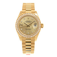 18 carat yellow gold case with a 18 carat yellow gold president bracelet. Fixed-diamond set bezel. Champagne diamond dial with gold-tone hands and diamonds hour markers. Dial Type: Analog. Date display at the 3 o'clock position. Rolex Calibre 2236 automatic movement with about 55 hours of power reserve. Scratch resistant sapphire crystal. Screw down crown. Solid case back. Case size: 28 mm. Round case shape. Water resistant at 100 meters / 330 feet. Functions: date, hour, minute, second, chronometer. Luxury watch style. Watch label: Swiss Made. Rolex Lady-Datejust Champagne Diamond Dial Automatic Ladies 18 Carat Yellow Gold President Watch 279138RBCDP. INFORMATION Brand: Rolex Series: Lady Datejust Collection Name: Lady Datejust Gender: Womens Model: 279138RBCDP Watch Label: Swiss Made Movement: Automatic Engine: Rolex Calibre 2236 Power Reserve: 55 hours CASE Case Size: 28 mm Case Material: 18kt Yellow Gold Case Shape: Round Case Back: Solid BAND Band Material: 18kt Yellow Gold President Band Type: Bracelet Band Color: Yellow Gold-tone DIAL Dial Color: Champagne Diamond Type: Analog Crystal: Scratch Resistant Sapphire Hands: Gold-tone Dial Markers: Diamonds Bezel: Fixed Bezel Color: 18kt Yellow Gold Bezel Material: Diamond Set Crown: Screw Down FEATURES Water Resistance: 100 meters / 330 feet Calendar: Date display at the 3 o'clock position Functions: Date, Hour, Minute, Second, Chronometer Watch Features: Diamond, Gold, Chronometer, Analog ADDITIONAL INFO Watch Style: Luxury Warranty: 2 Year Jomashop Warranty Jomashop Sku: RLX279138RBCDP Department: Watches Category: Watches